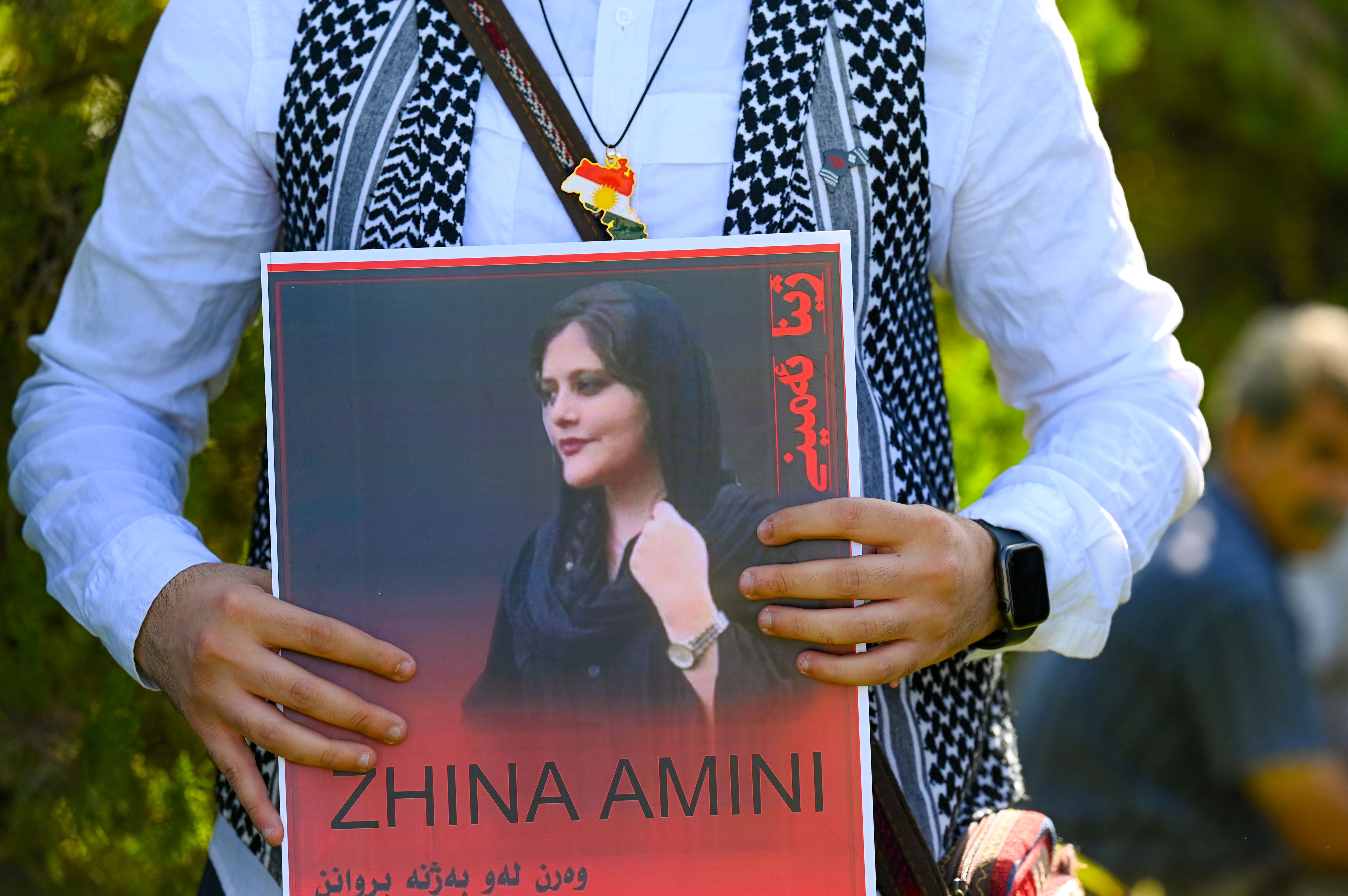 A protester holds a poster in Erbil which shows the portrait of Mahsa (Zhina) Amin. Date: September 24, 2022. Photo: Bilind T. Abdullah/Rudaw