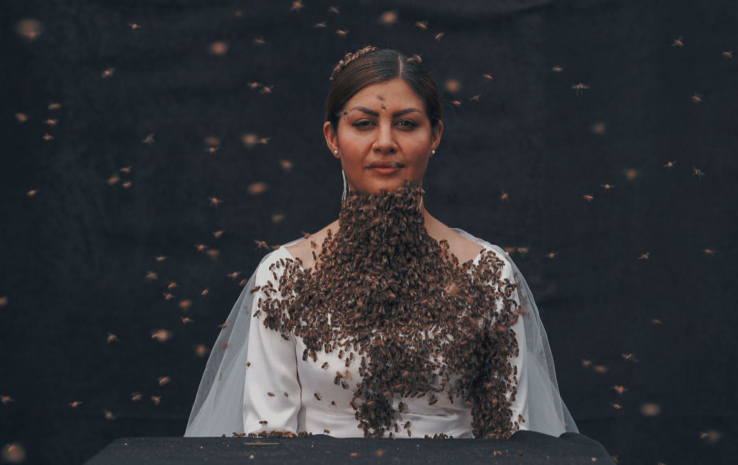 Nigar Salar, standing still as she is covered with thousands of bees. Photo: Bilind T. Abdullah/Rudaw