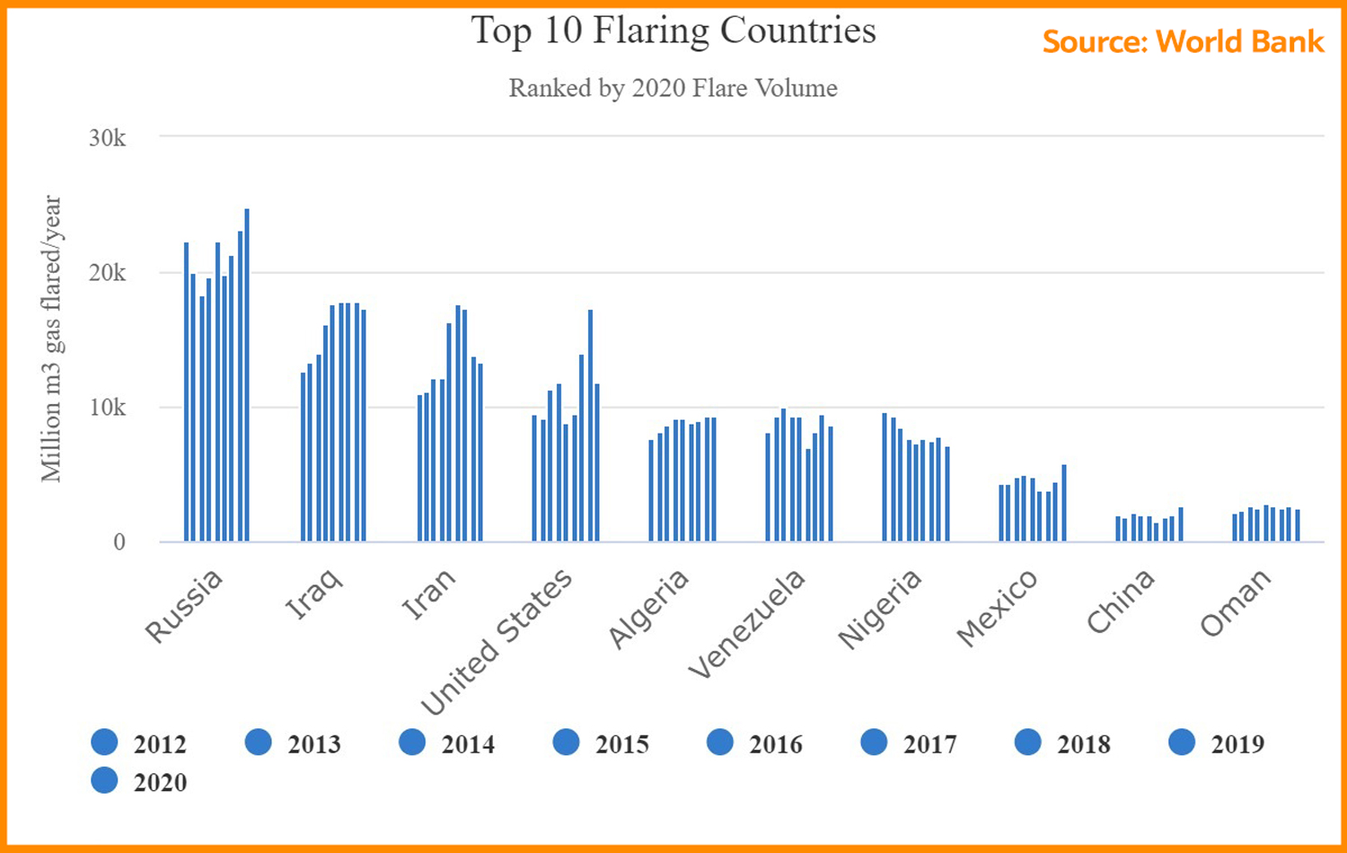 Iraq ranks second globally in flaring associated gas, behind Russia. According to the World Bank, in 2020 Iraq flared 17.37 billion cubic meters of gas and Russia burned off 24.88 billion.