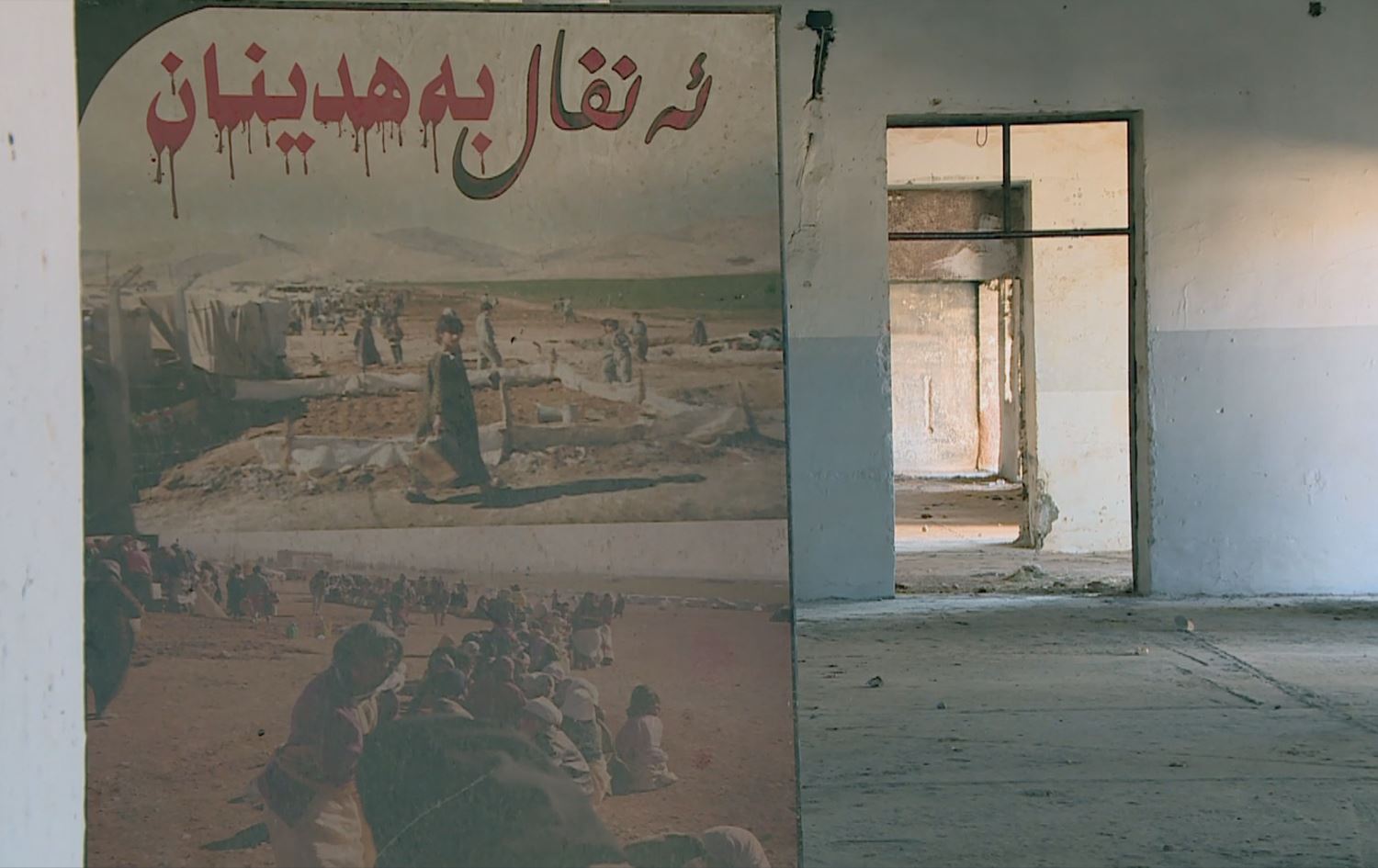 A poster depicting the tragedy of people of Badinan hangs on the walls of one of the Baath regime's old prisons in Duhok. Photo: Rudaw