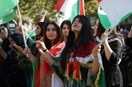 People wave Kurdish flag in Paris, France as the nation was preparing itself to vote in the histroic referendum. There are an estimated 150,000 eligible voters abroad. Photo: AFP / Zakaria Abdelkafi.
