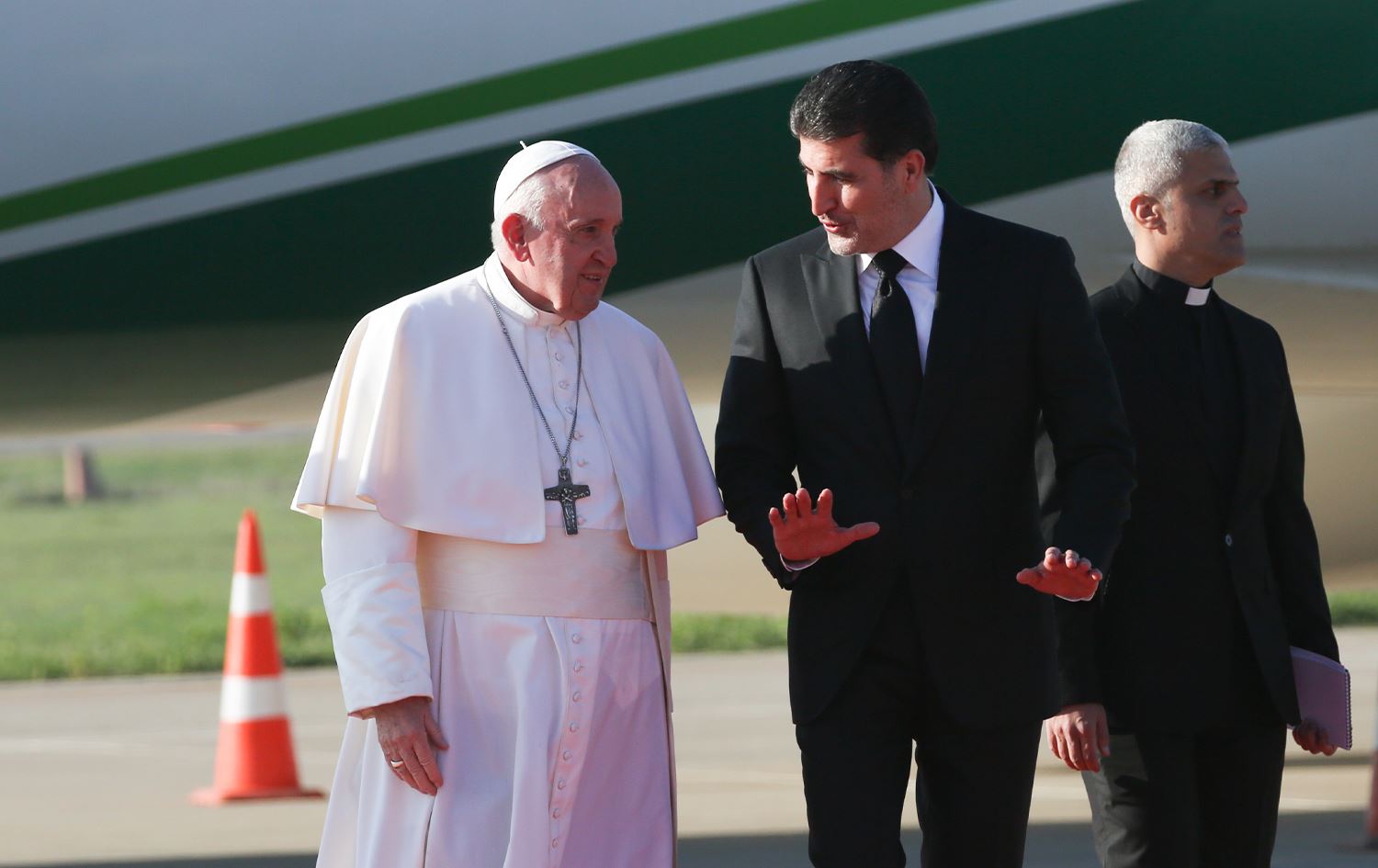 Kurdistan region President Nechirvan Barzani (right) welcomes Pope Francis (left) at Erbil International Airport on March 7, 2021. Photo: Bilind T. Abdullah/Rudaw