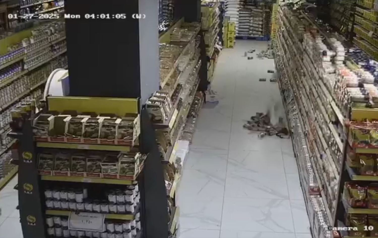 Security cam footage shows cans of food falling off shelves in a market in Kalar town, Sulaimani province on January 27, 2025. Photo: Submitted