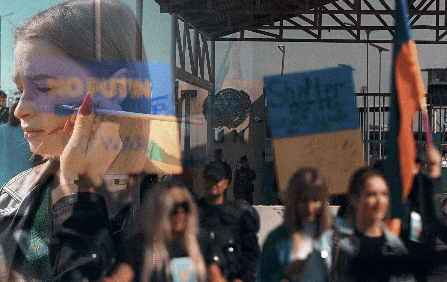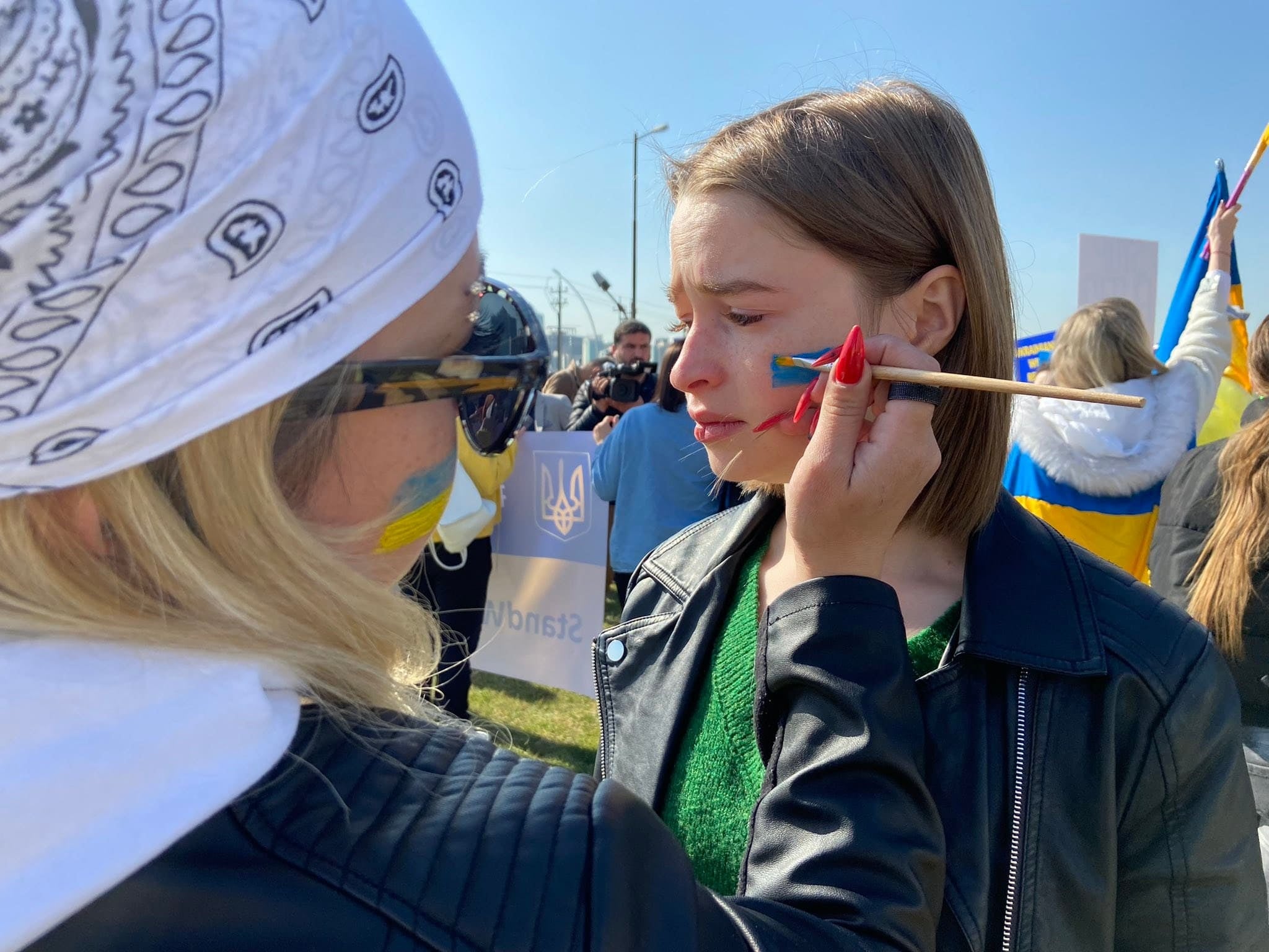 Standing with friends was 27-year-old Irina Soloviova, whose tears had ruined the Ukrainian flag painted on her face as she thought of her family in Ukraine who she had lost touch with soon after war erupted on Thursday.
