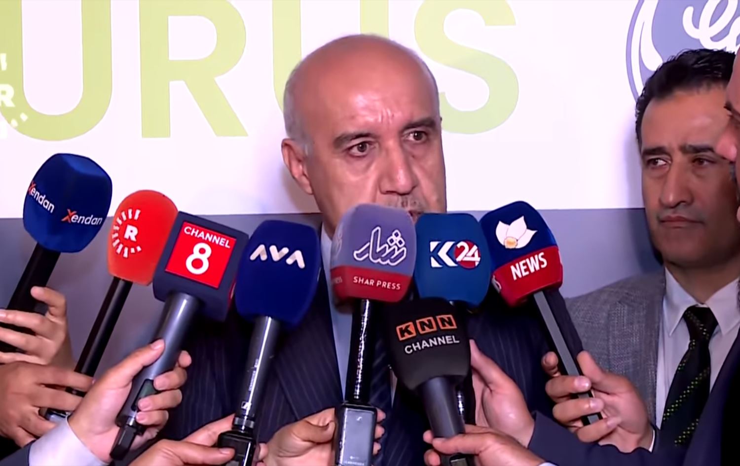 Kamal Mohammed, the Kurdistan Regional Government’s (KRG) acting natural resources minister, speaking to reporters in Sulaimani on April 27, 2025. Photo: Rudaw