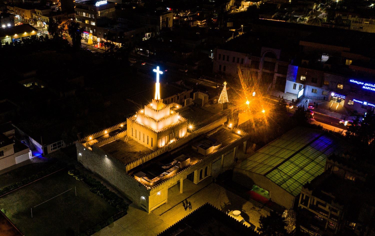 The Chaldean Catholic Cathedral of Saint Joseph in Ankawa, lit up for Christmas Eve, on December 24, 2020. Photo: Bilind T. Abdullah/Rudaw