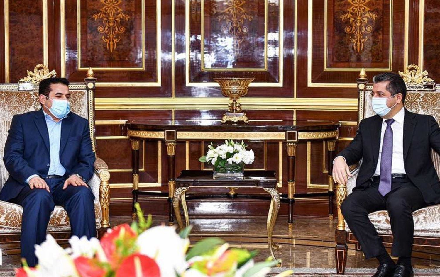 Iraq’s National Security Advisor Qassim al-Aaraji (left) speaks with Kurdistan Region Prime Minister Masrour Barzani in Erbil on September 27, 2020. Photo: handout/KRG