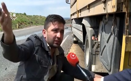 A truck driver speaks with Rudaw while his tire was punctured in late-April 2019 on the main Erbil-Koya road.