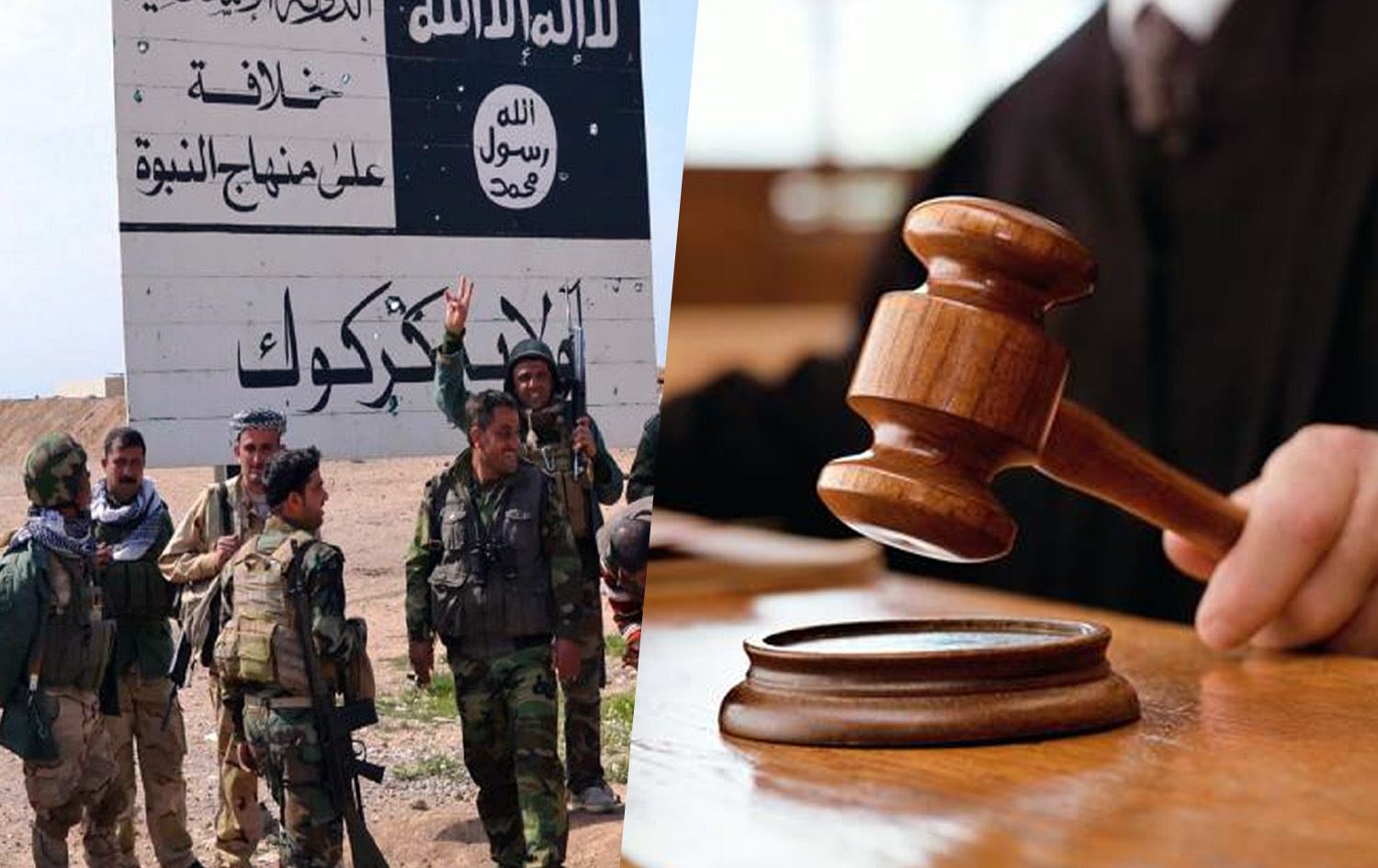 From left: Peshmerga fighters stand next to an ISIS sign in Kirkuk on March 9, 2015, and a file photo of court. Photos: AFP