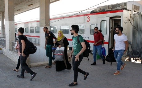 Iraqi passengers disembark from a train from Baghdad in the city of Fallujah on August 19, 2019. Photo: AFP