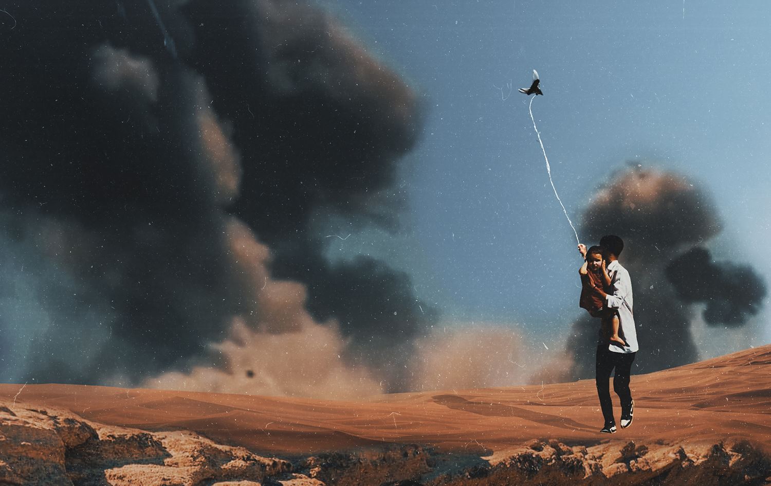 Iran’s strikes near Kirkuk’s Pirde and 2-year old Haina covering her ears while being carried by her neighbor. Photos: Rudaw/submitted. Graphic: Aland Qaradaxi/Rudaw
