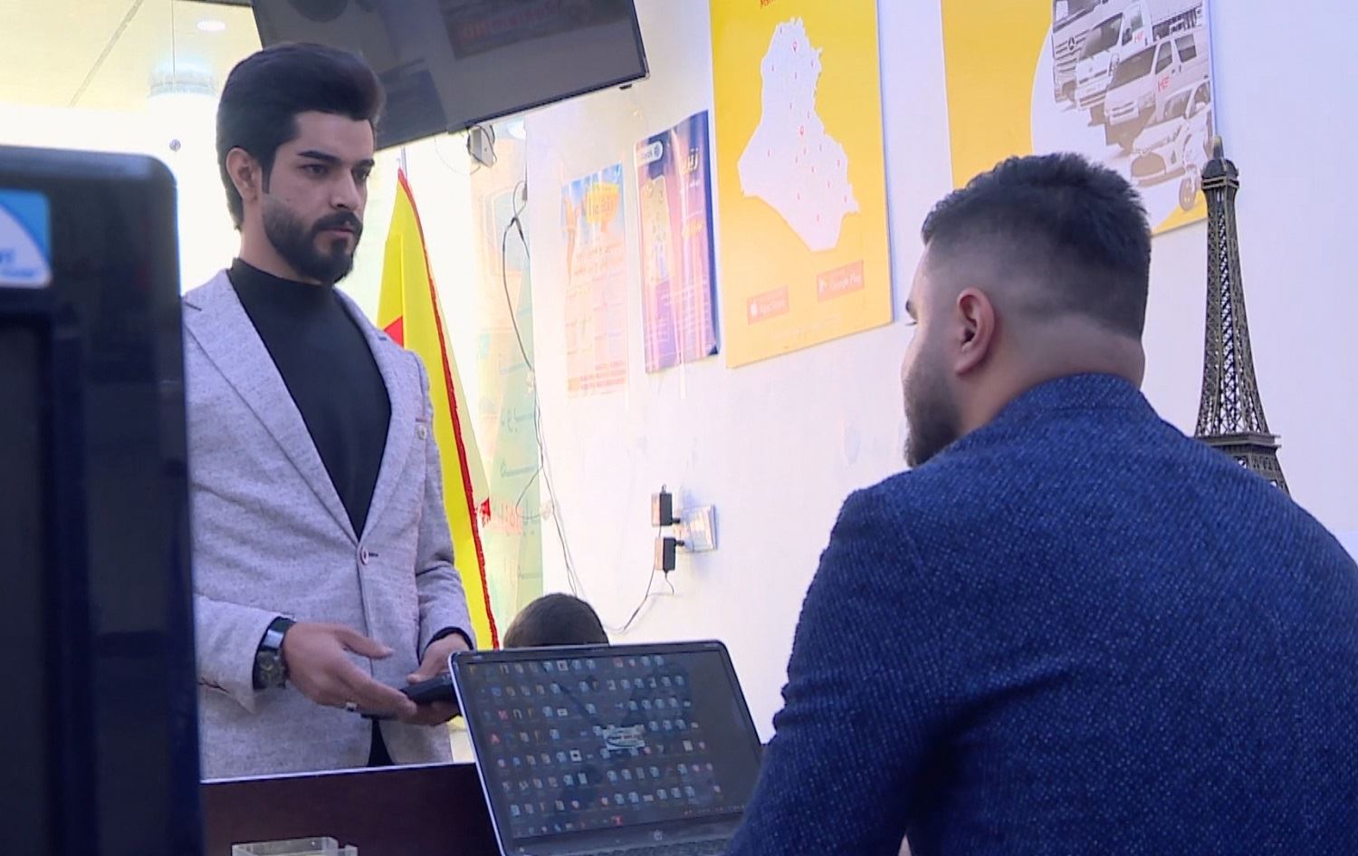 Mikail Kamal (left) visits a travel agency in Soran on October 28, 2021 to ask about a flight to Belarus. Unemployed, he is hoping to migrate to Europe. Photo: screengrab/Rudaw