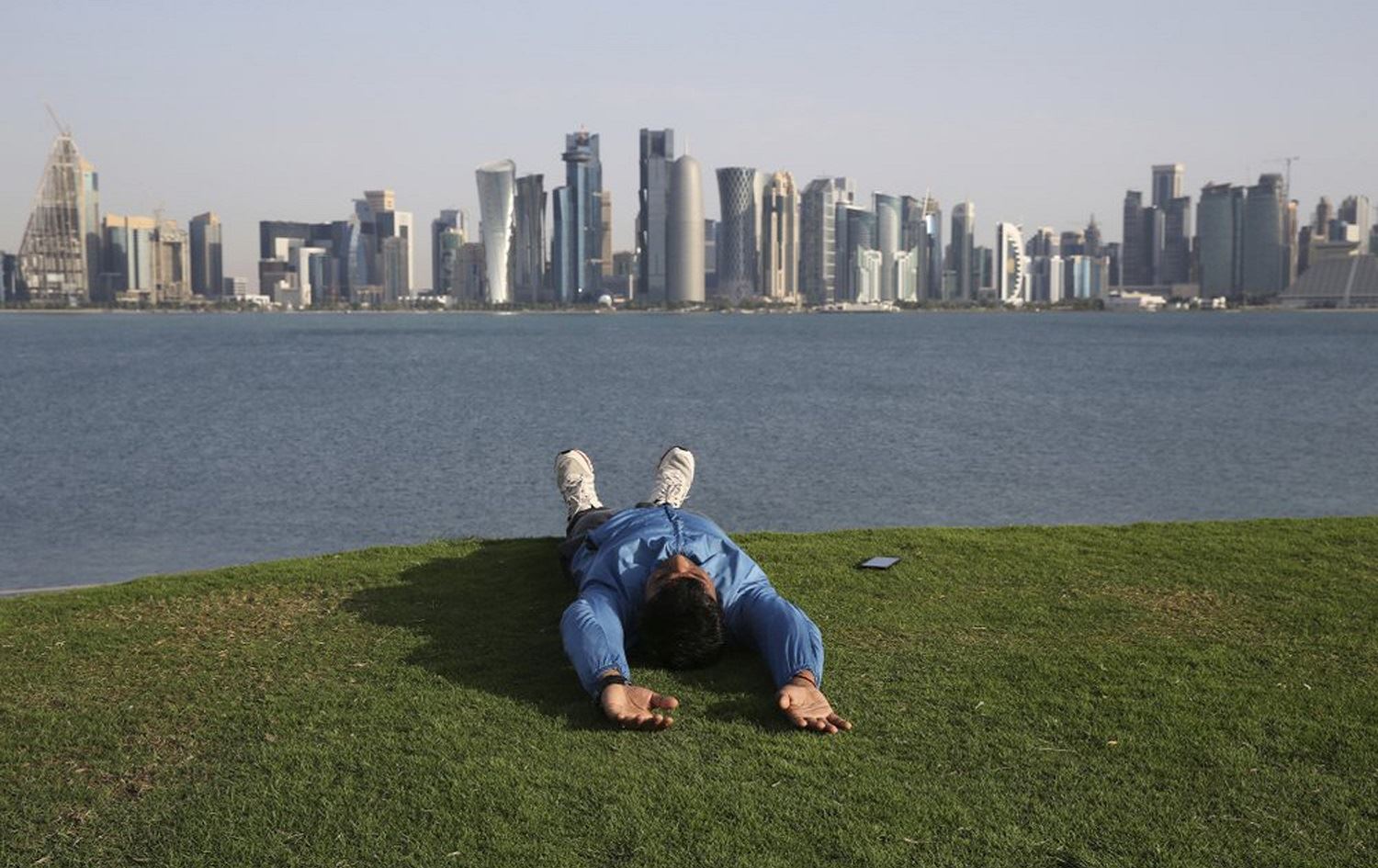 A man lies on a grass-covered hill at MIA park overlooking the skyline of Doha, Qatar, April 19, 2019. File photo: Kamran Jebreili / AP