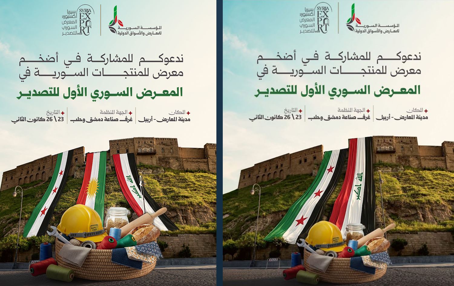 Syrian fairs authorities' advertisement for Erbil fair with and without the Kurdistan flag. Graphic: Rudaw