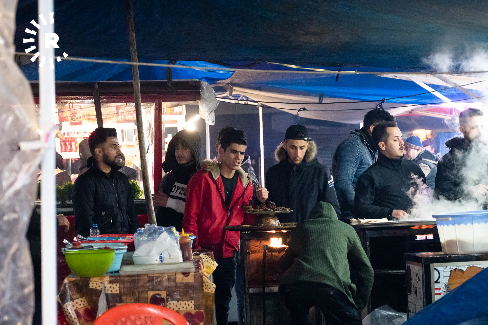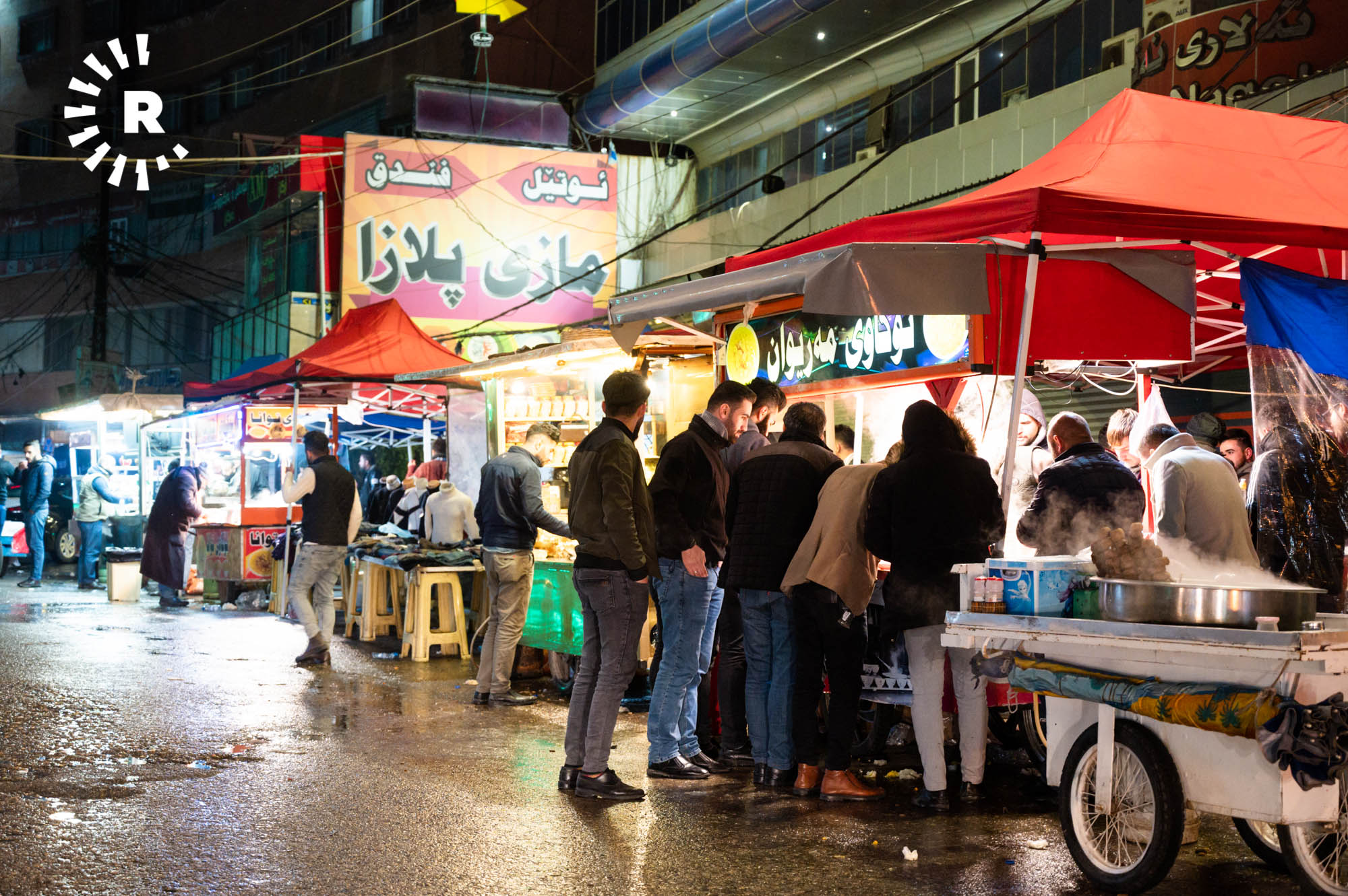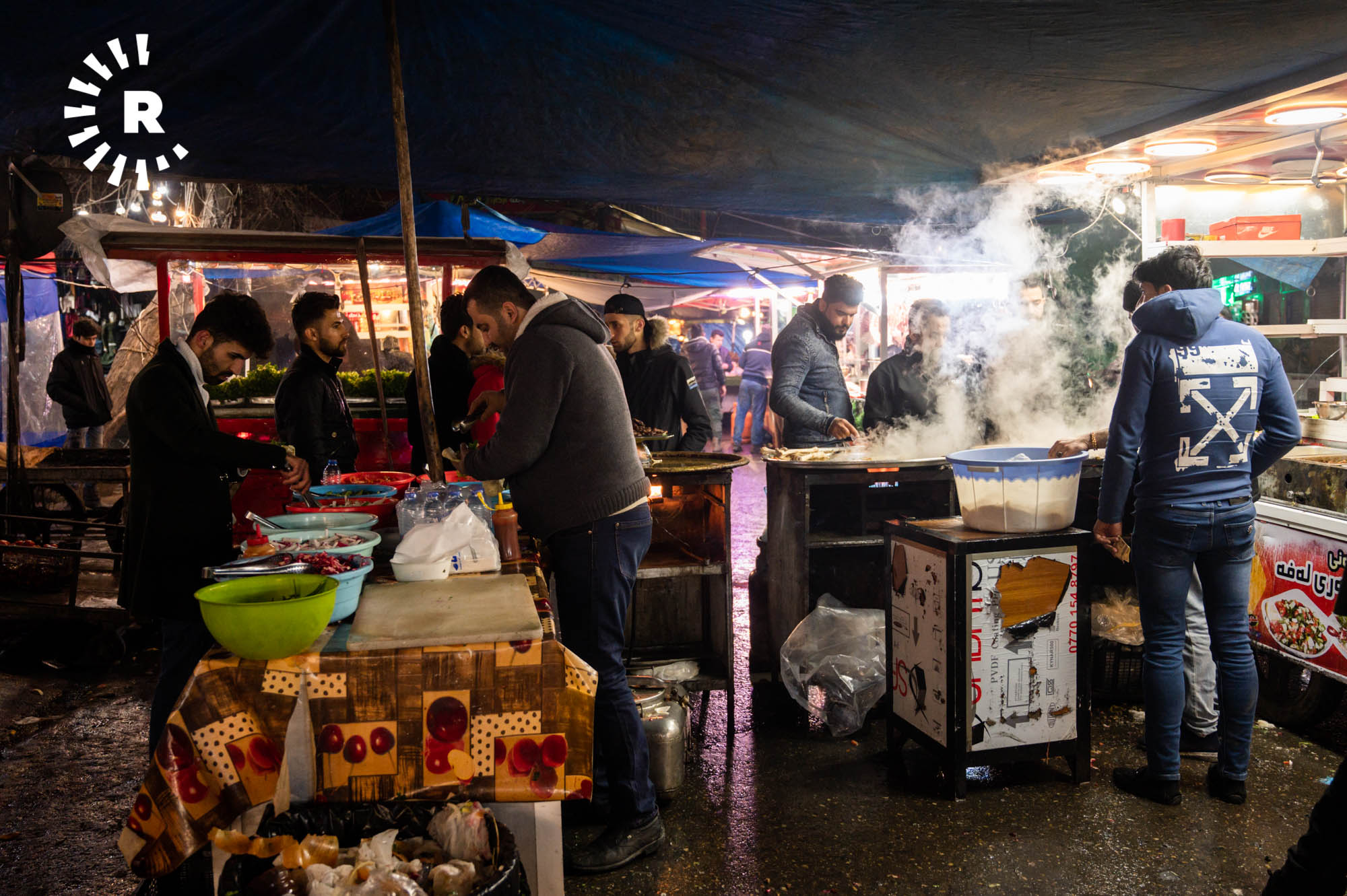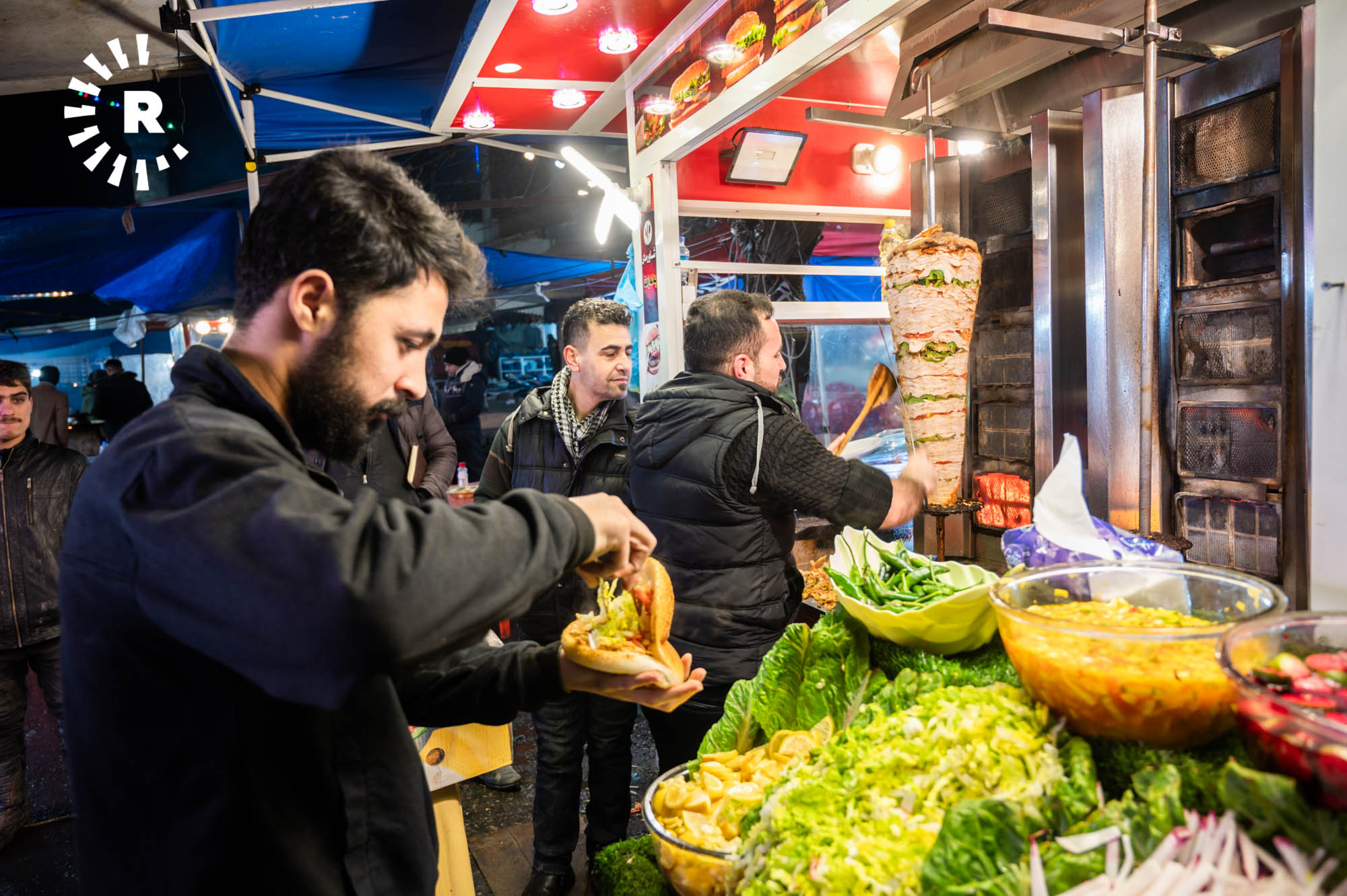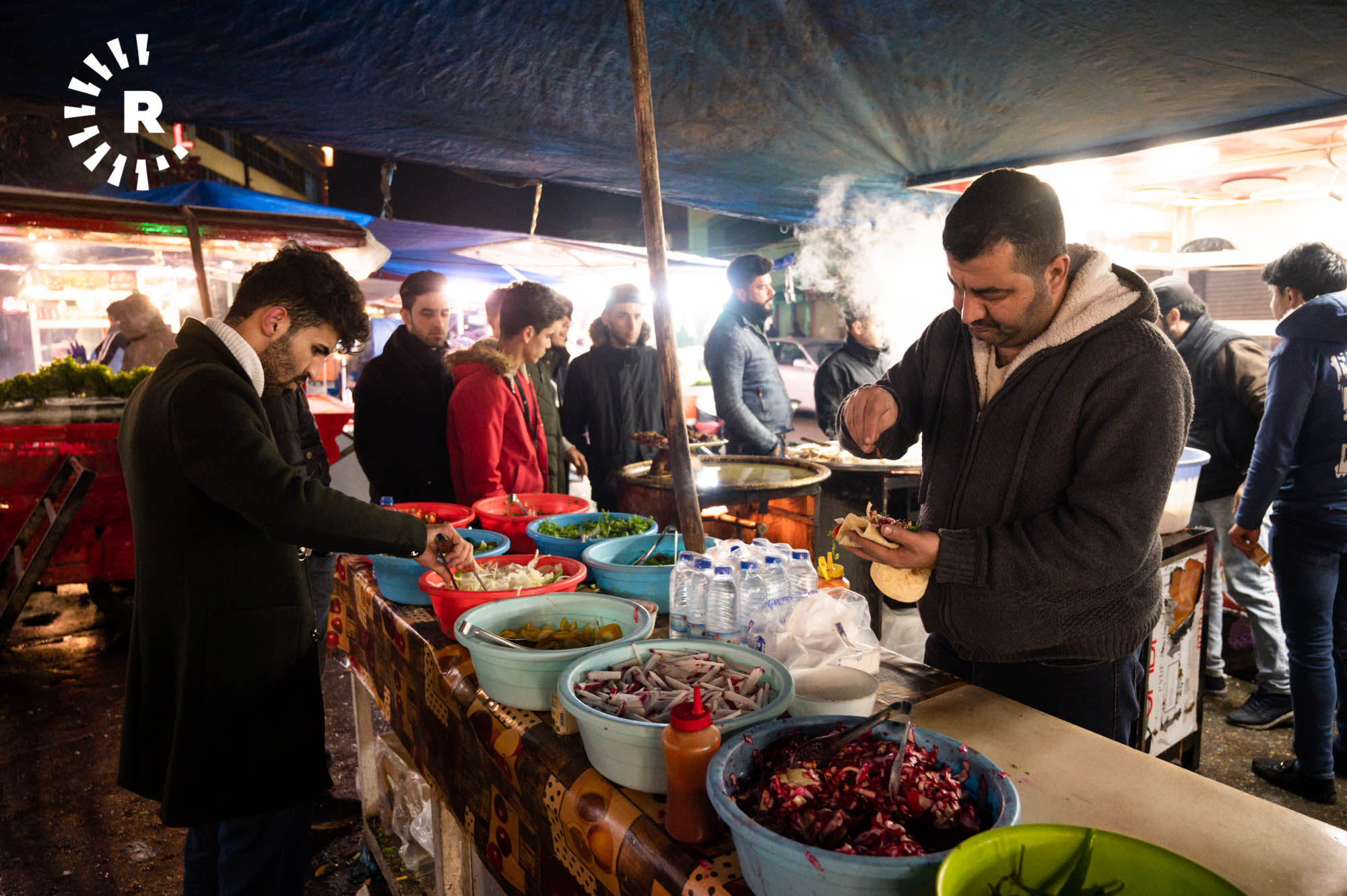 Some visitors, including tourists, simply stop by for a glass of chai and to soak up the atmosphere. Hunar Ali, who runs a shawarma kitchen, told Rudaw visitors can buy food throughout the night thanks to the busy street market.