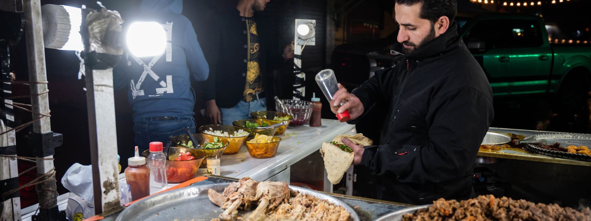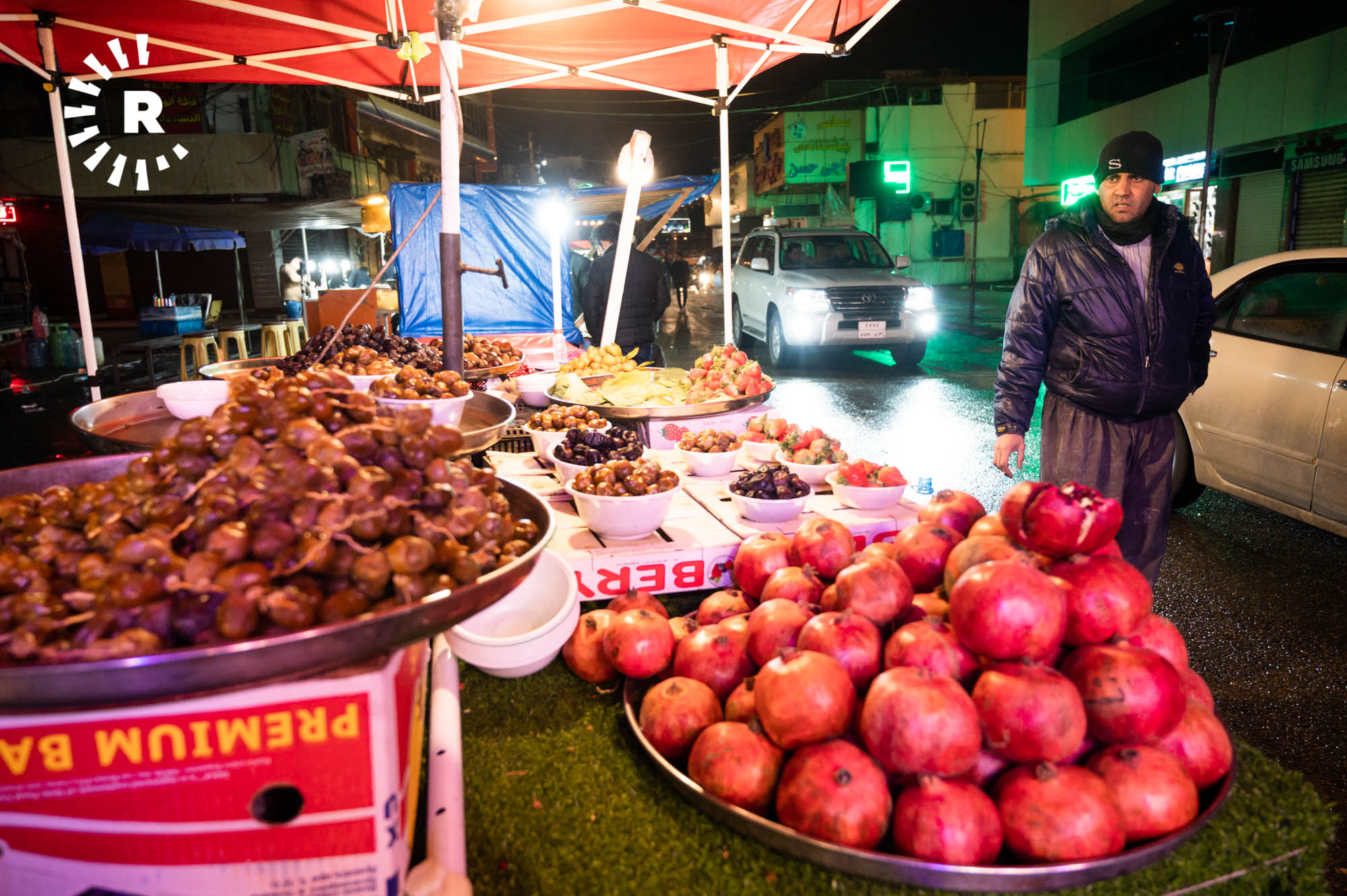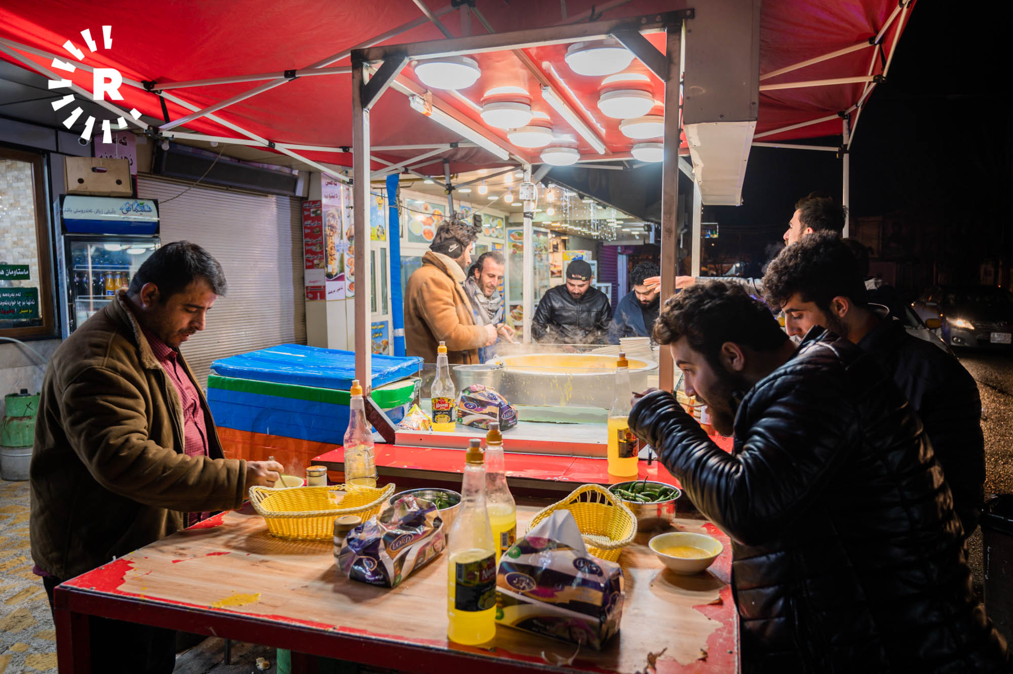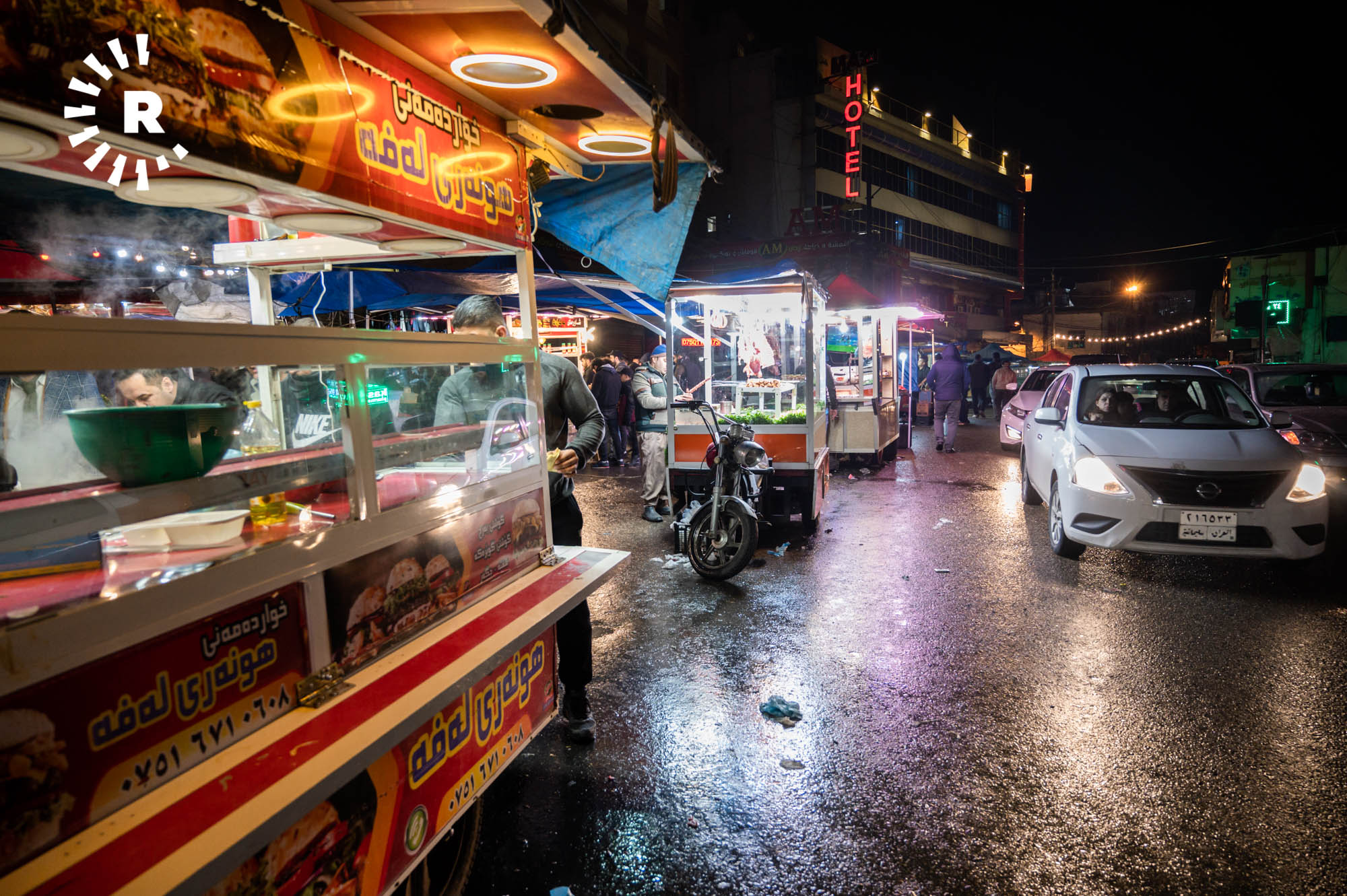 Some visitors, including tourists, simply stop by for a glass of chai and to soak up the atmosphere. Hunar Ali, who runs a shawarma kitchen, told Rudaw visitors can buy food throughout the night thanks to the busy street market.