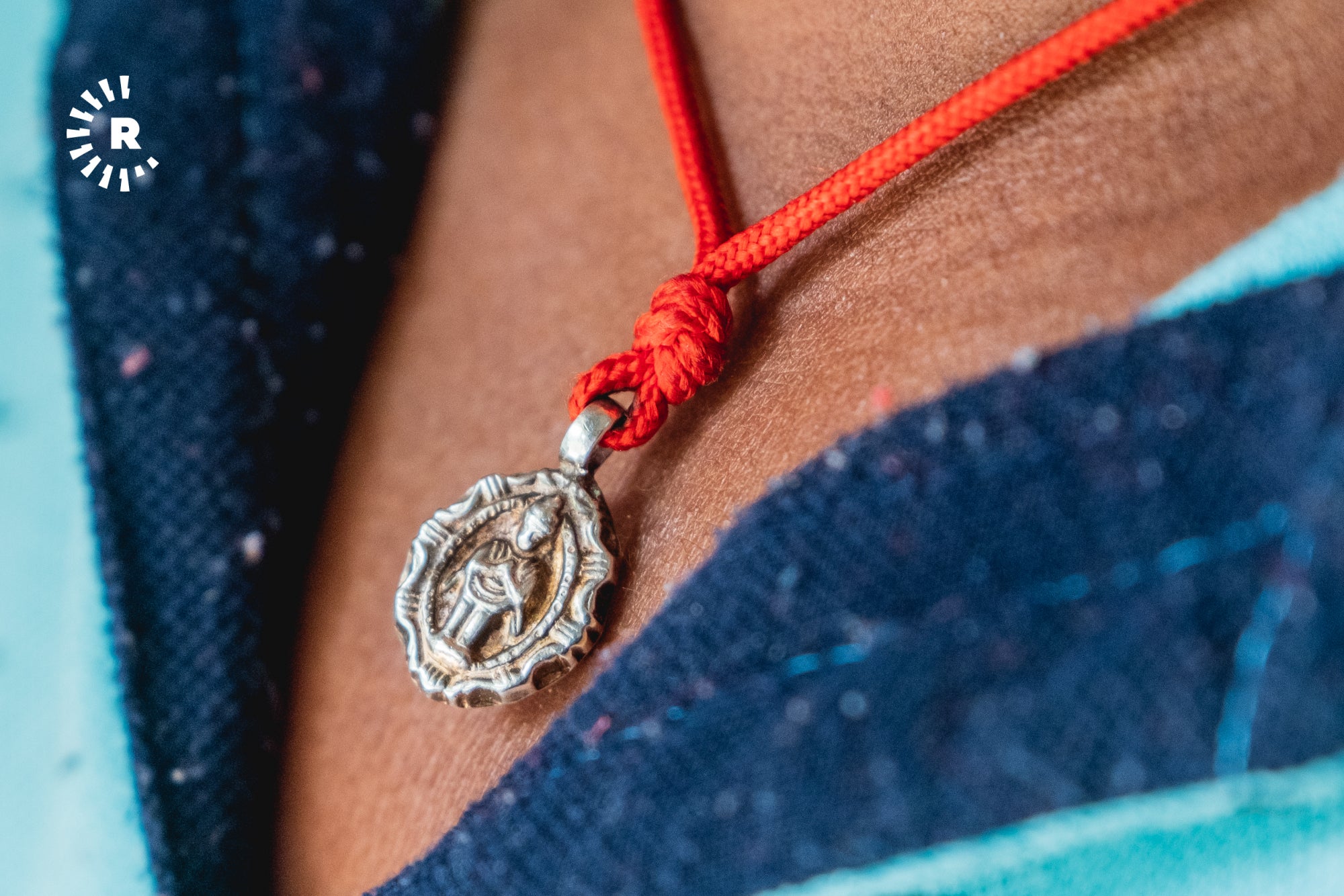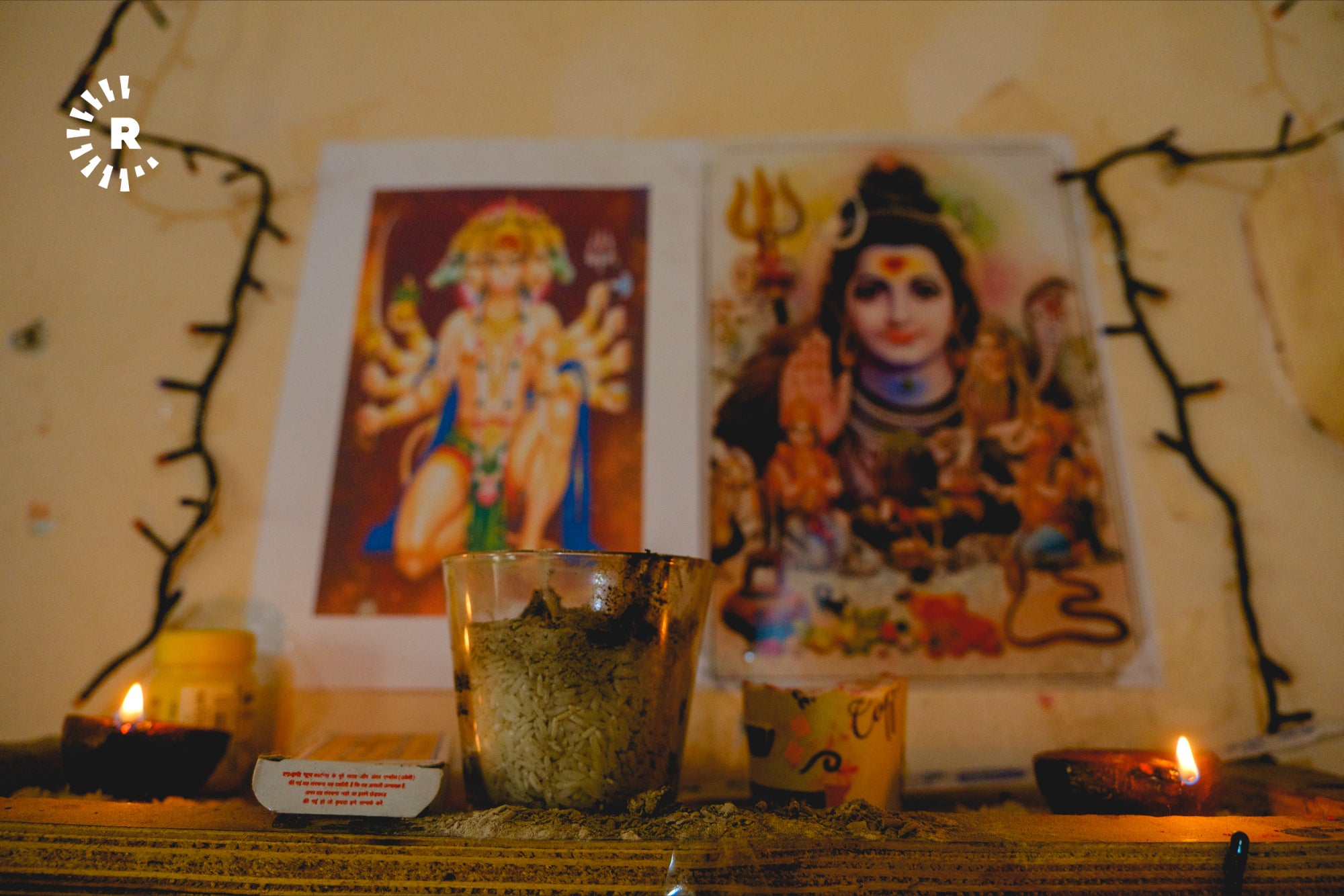 The drabness of the surroundings is interrupted by colourful Hindu icons. A dusty glass of rice and turmeric sits at Lord Shiva’s feet as an offering for wealth.