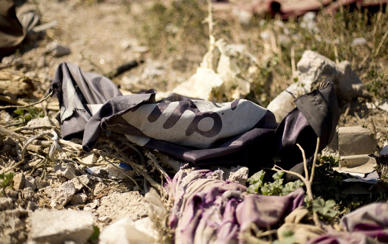 An Islamic State (ISIS) flag lies in a tent encampment after US-backed Syrian Democratic Forces (SDF) fighters took control of Baghouz, Syria, March 23, 2019. File photo: Maya Alleruzzo / AP