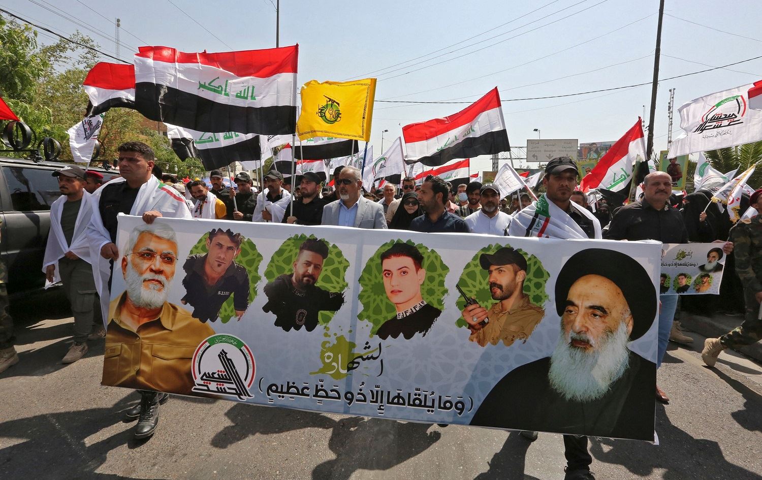 People march with a banner showing (L to R) Iraq's slain PMF commander Abu Mahdi al-Muhandis, other slain members of the group, and Iraq's top Muslim Shiite cleric Grand Ayatollah Ali al-Sistani, during a symbolic funerary parade in Baghdad on June 29, 2021. Photo: Sabah Arar/AFP