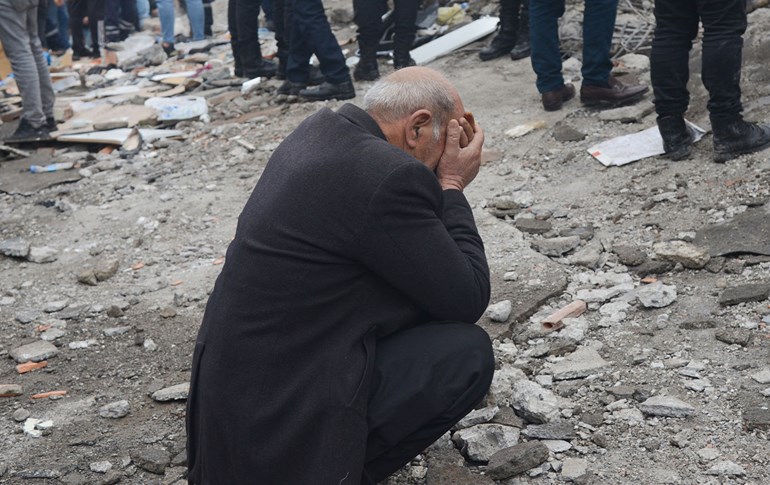 A man reacts as people search for survivors through the rubble in Diyarbakir, on February 6, 2023. Photo: Ilyas Akengin/AFP