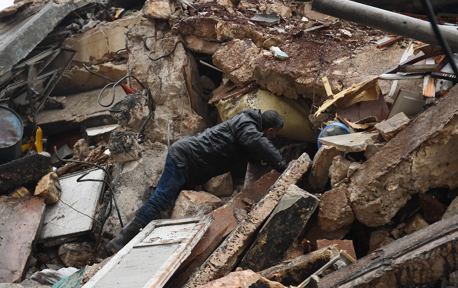 A man looks for survivors under the rubble of a collapsed building after an earthquake in the regime-controlled northern Syrian city of Aleppo on February 6, 2023. Photo: AFP