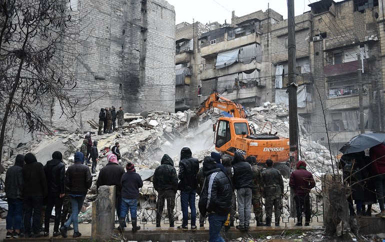 Onlookers watch as rescue teams look for survivors under the rubble of a collapsed building in Syria’s Aleppo on February 6, 2023. Photo: AFP