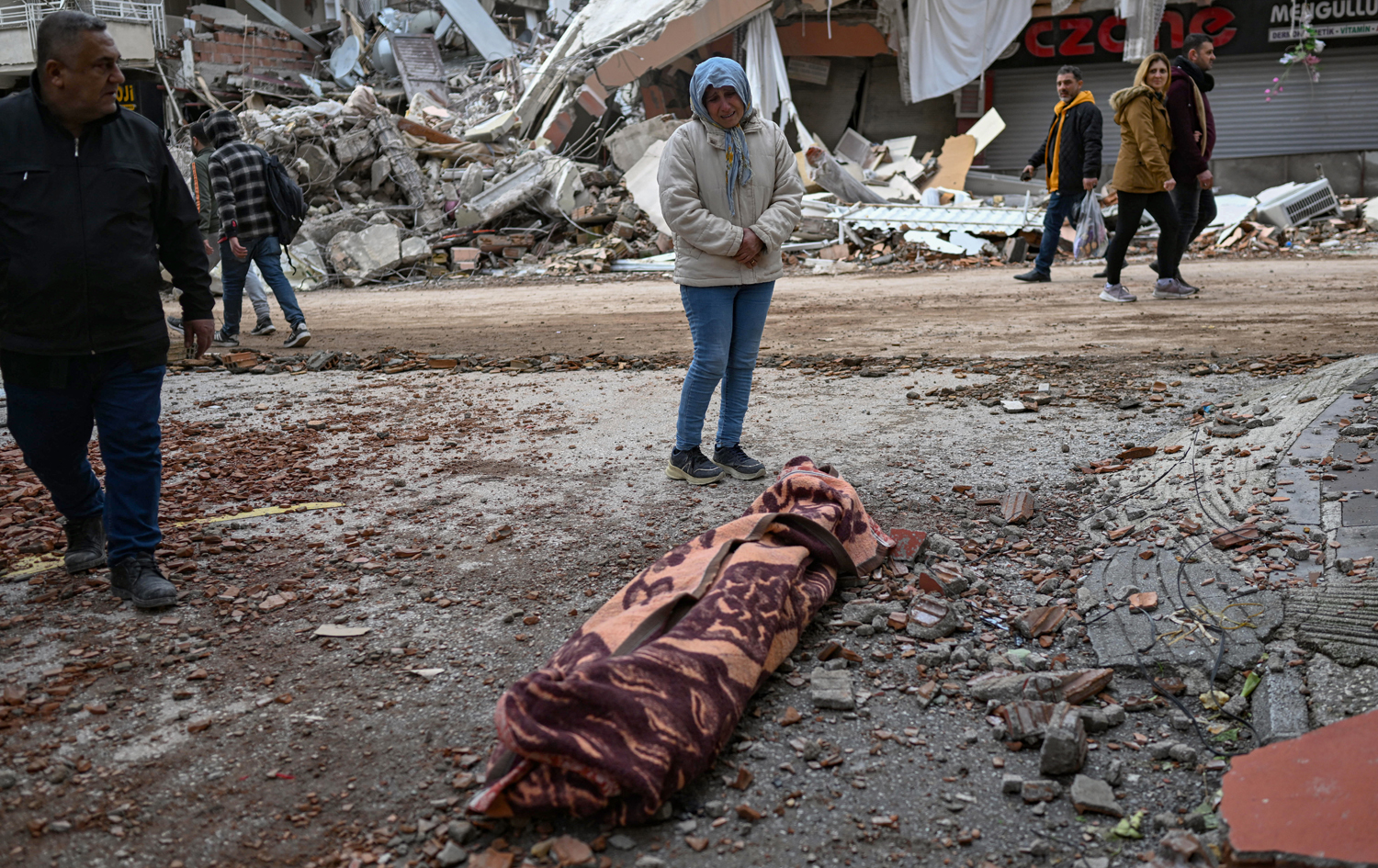 A woman weeps as she stands beside the body of one of the earthquake victims in Turkey’s Hatay on February 7, 2023. Photo: Bulent Kilic/AFP
