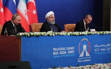 An image on September 7, 2018, shows Iranian President Hassan Rouhani (center) during a press conference with Turkish President Recep Tayyip Erodgan (right) and Russian President Vladimir Putin in Tehran after their trilateral meeting as Iran hosted a summit on the Syrian conflict. Photo: AFP / Iranian President's Office