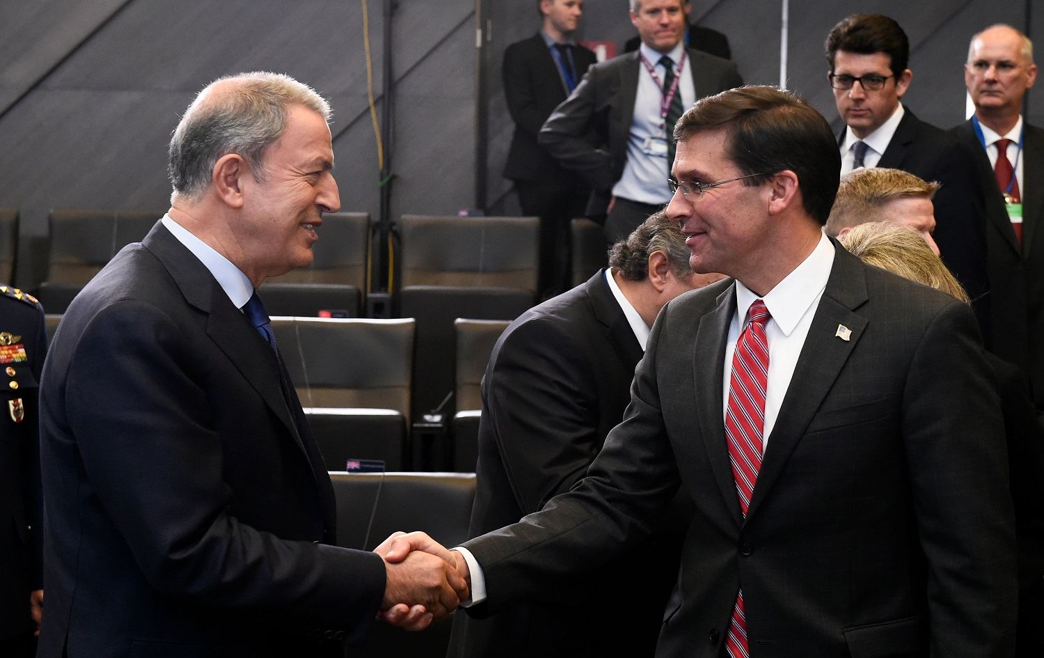 Turkish Defence minister Hulusi Akar shakes hands with Acting US Secretary for Defense Mark Esper during a NATO defence ministers meeting, at the NATO headquarters in Brussels on October 24, 2019. Photo: John Thys/AFP