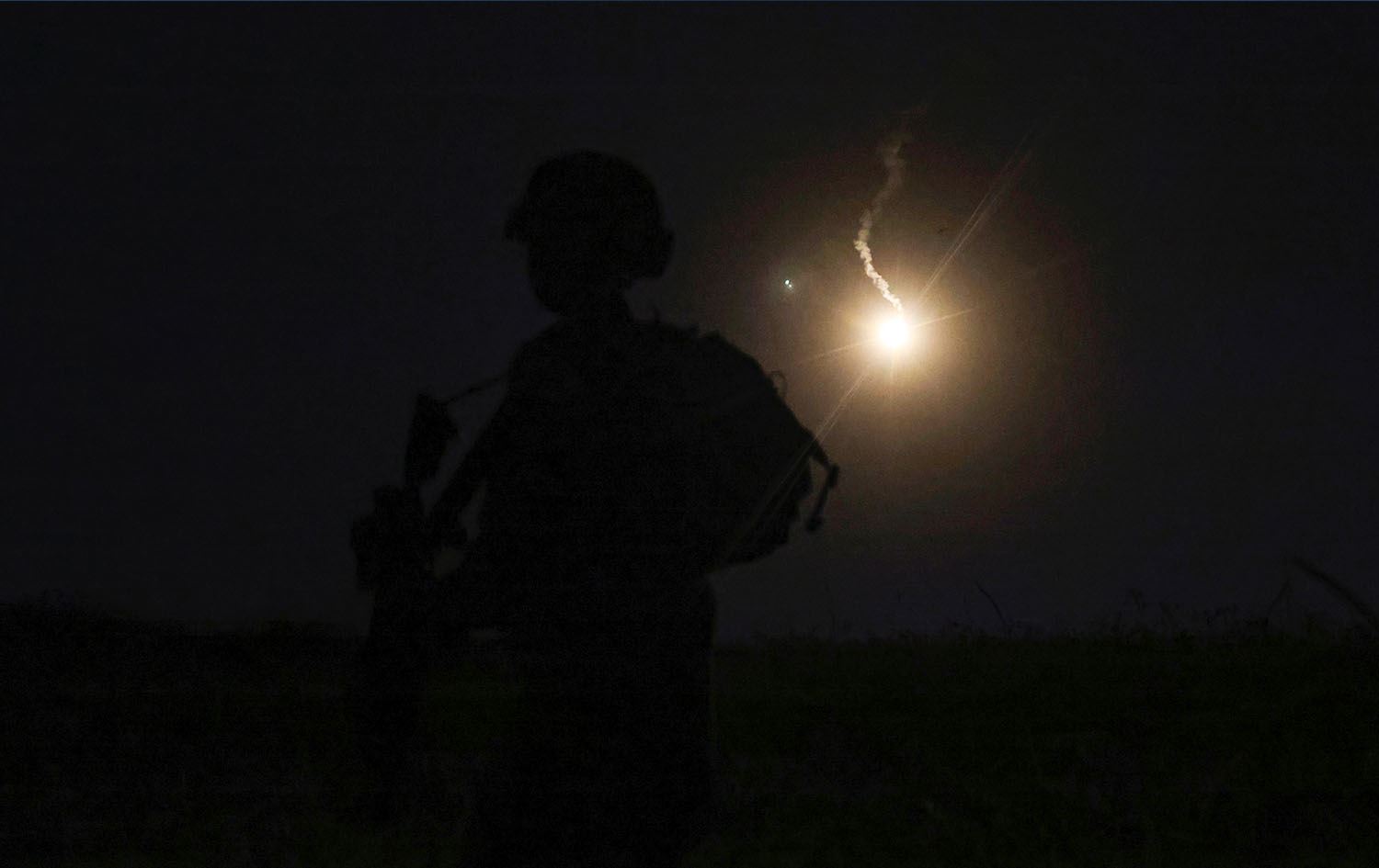 The silhouette of an Israeli soldier is outlined in the sky by a flare fired to search for a rocket that landed near Kibbutz Meitsar in the Israeli annexed Golan Heights, April 9, 2023. Photo: Jalaa Marey/AFP