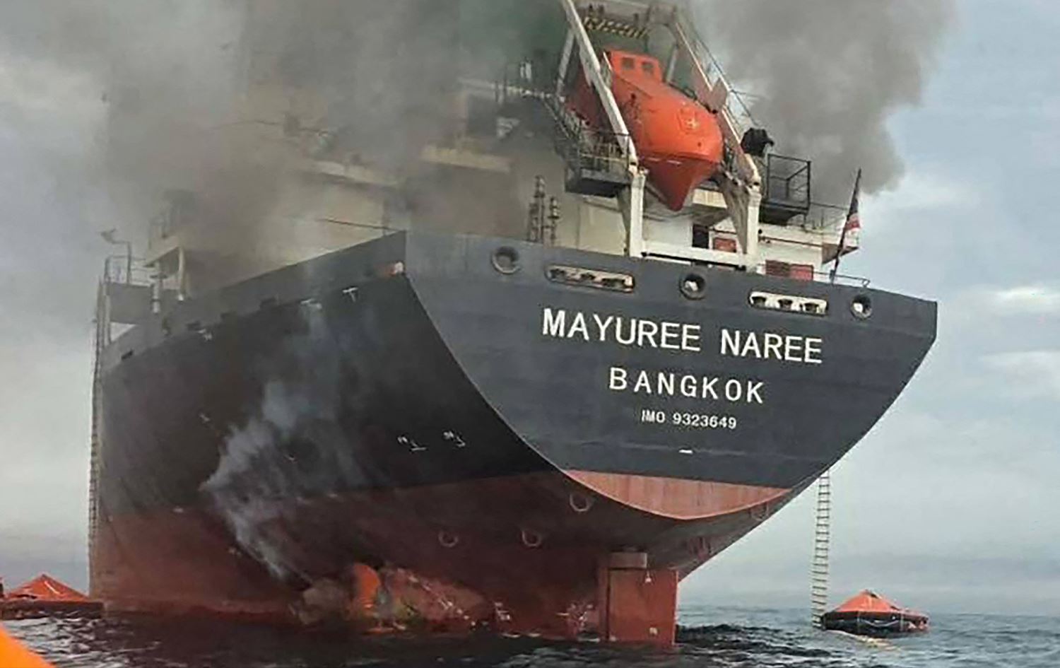 A handout photo taken and released by the Royal Thai Navy shows smoke rising from the Thai bulk carrier “Mayuree Naree” near the Strait of Hormuz after an attack on March 11, 2026. Photo: Handout / Royal Thai Navy / AFP