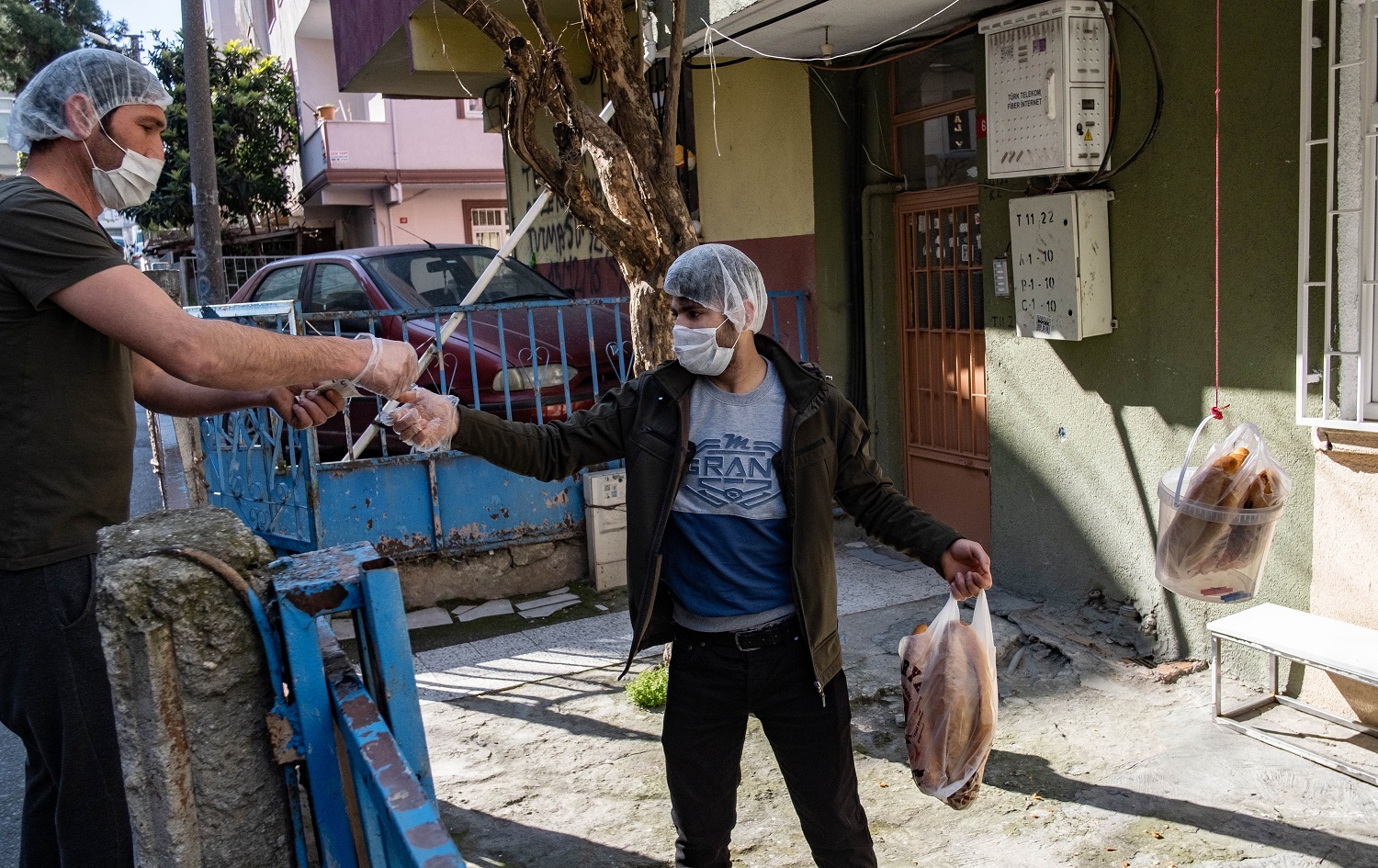 A baker puts bread in a basket hung from a window in Istanbul on April 11, 2020 in Istanbul. Photo: Yasin Akgul / AFP