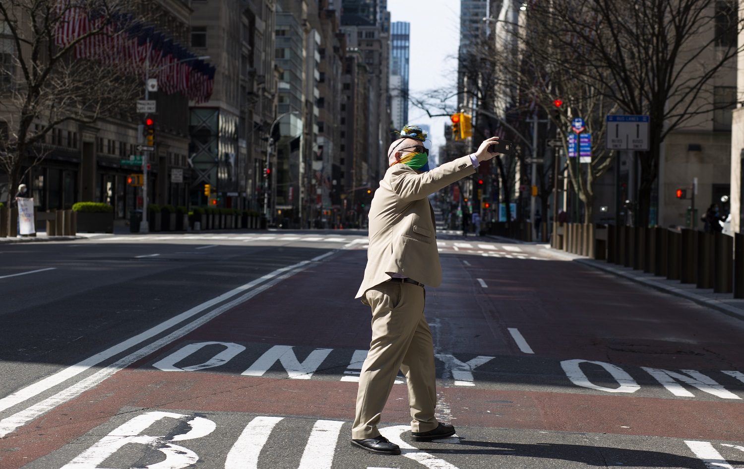 A man wearing an Easter suit and face mask records a video in front of New York's Saint Patrick Cathedral on April 12, 2020. Photo: Kena Betancur / AFP