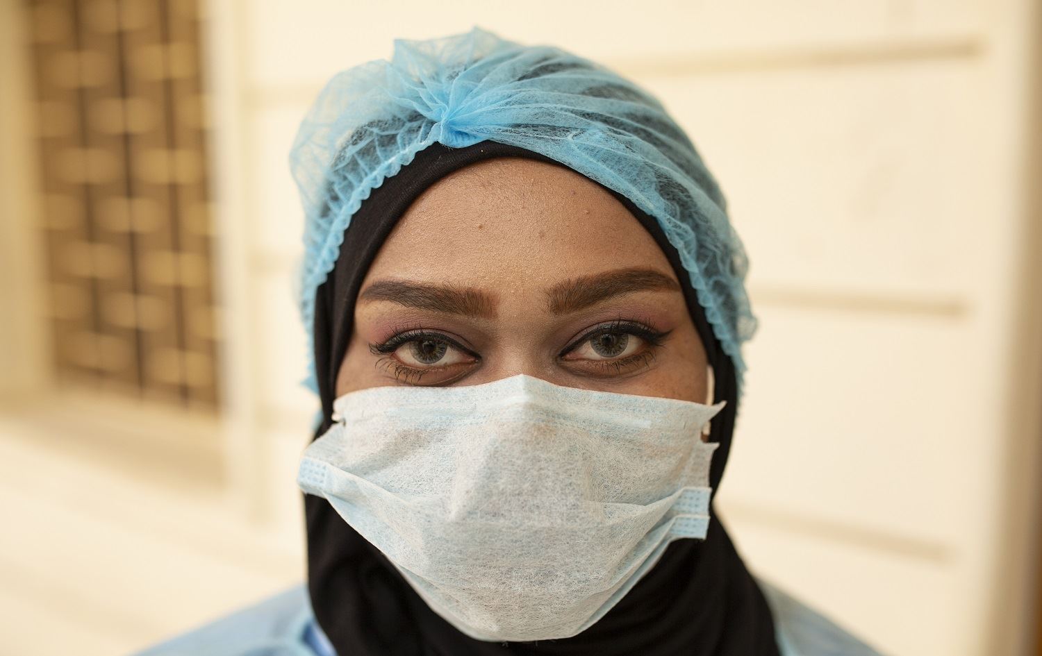 An Iraqi medic wearing a face mask and covering her headscarf with a protective cap poses for a photo at Basra University Hospital, where COVID-19 coronavirus patients are treated, in the southern Iraqi city of the same name on April 1, 2020. Photo: Hussein Faleh/ AFP