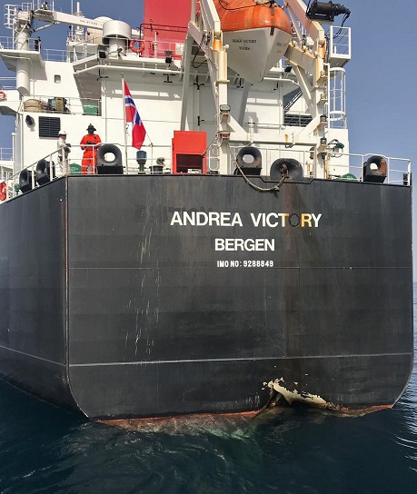 The Andrea Victory's managers, Thome Group, said the tanker had a hole in the hull area "after being struck by an unknown object on the waterline."