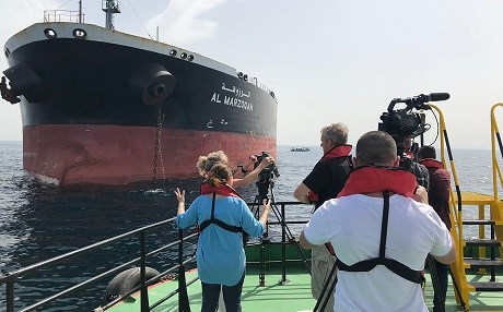 A picture taken on May 13, 2019 off the coast of the Gulf emirate of Fujairah shows Norwegian oil tanker Andrea Victory, one of the four tankers damaged in alleged "sabotage attacks" in the Gulf the previous day. Photo: handout/Emirati National Media Council/AFP