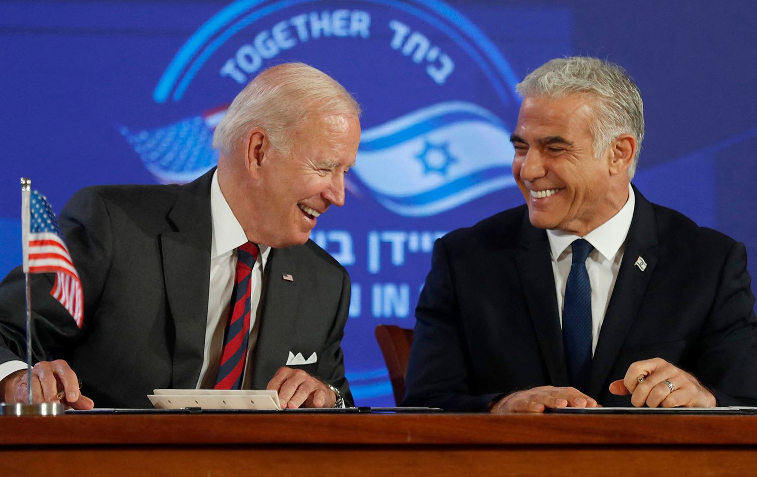US President Joe Biden and Israel's Prime Minister Yair Lapid, smile after signing a security pledge in Jerusalem, on July 14, 2022. Photo: Atef Safadi/AFP