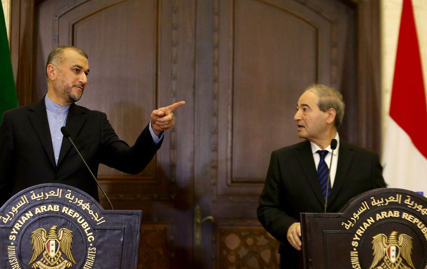 Iranian Foreign Minister Hossein Amir Abdollahian (L) and Syrian Foreign Minister Faisal Mekdad hold a joint press conference at the Syrian Foreign Ministry in Damascus on October 13, 2023. Photo: Louai Beshara/AFP
