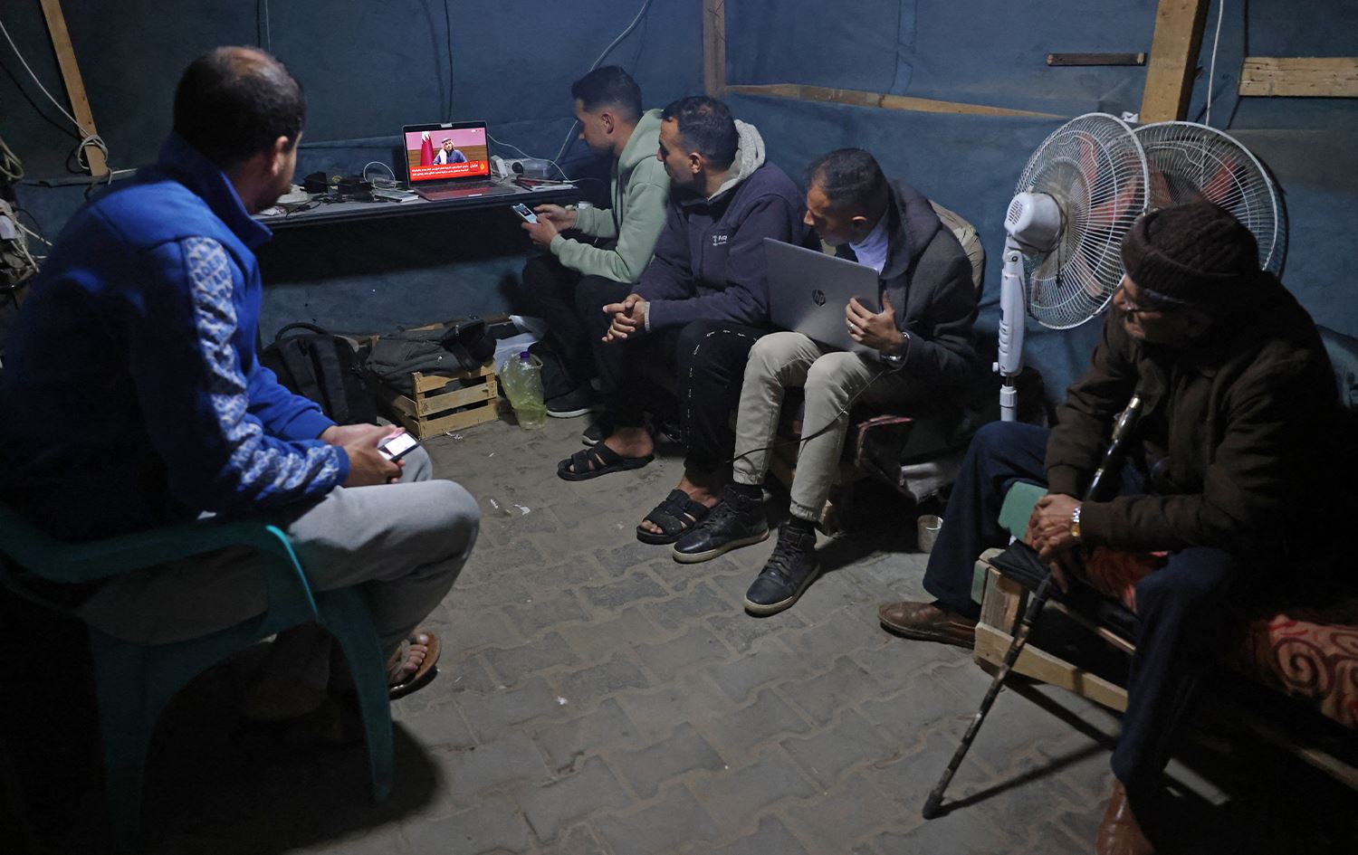 People watch the live broadcast of a press conference being addressed by Qatar’s prime minister inside a tent in Khan Yunis in the Gaza Strip on January 15, 2025. Photo: Bashar Taleb/AFP