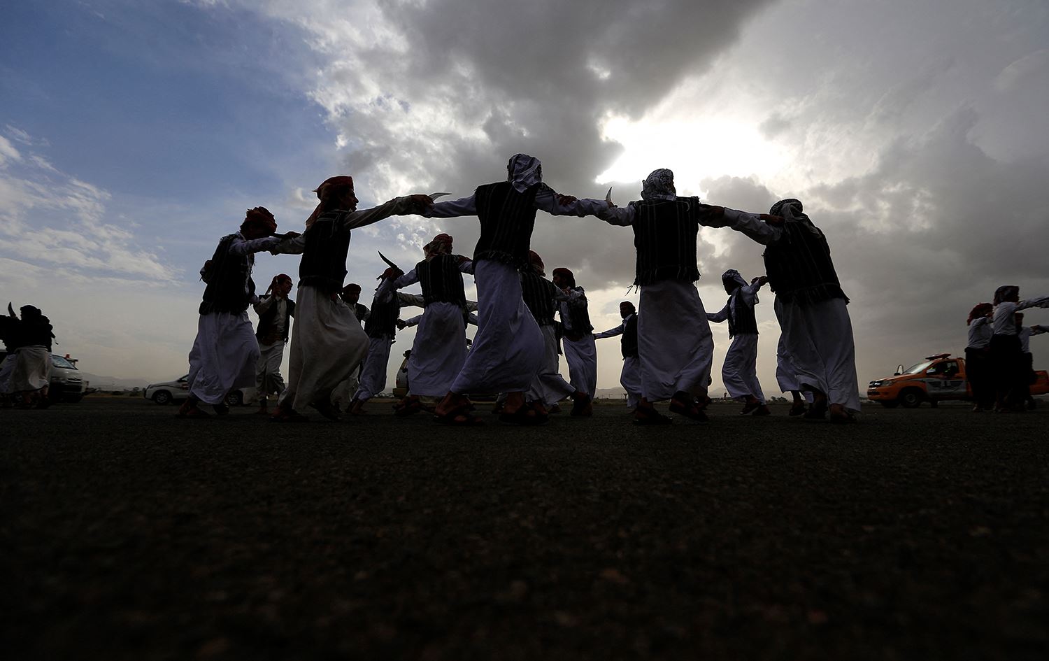 Houthi rebels perform a dance to welcome the prisoners upon their arrival at Sanaa airport on April 14, 2023. Photo: Mohammed Huwais/AFP