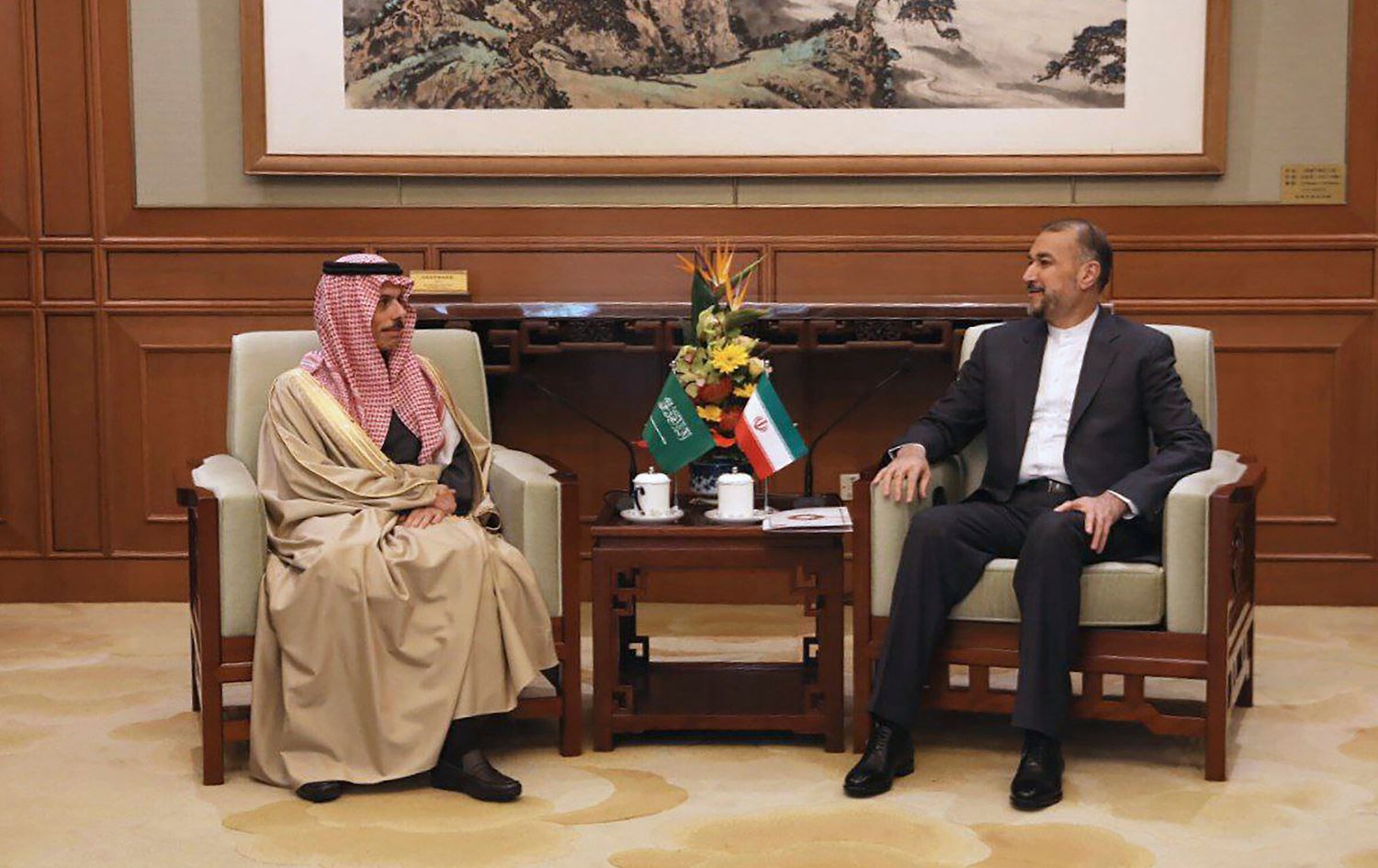 Iran's Foreign Minister Hossein Amir-Abdollahian (right) meets with his Saudi Arabian counterpart Prince Faisal bin Farhan Al Saud in Beijing, China on April 6, 2023. Photo: Iranian Foreign Ministry