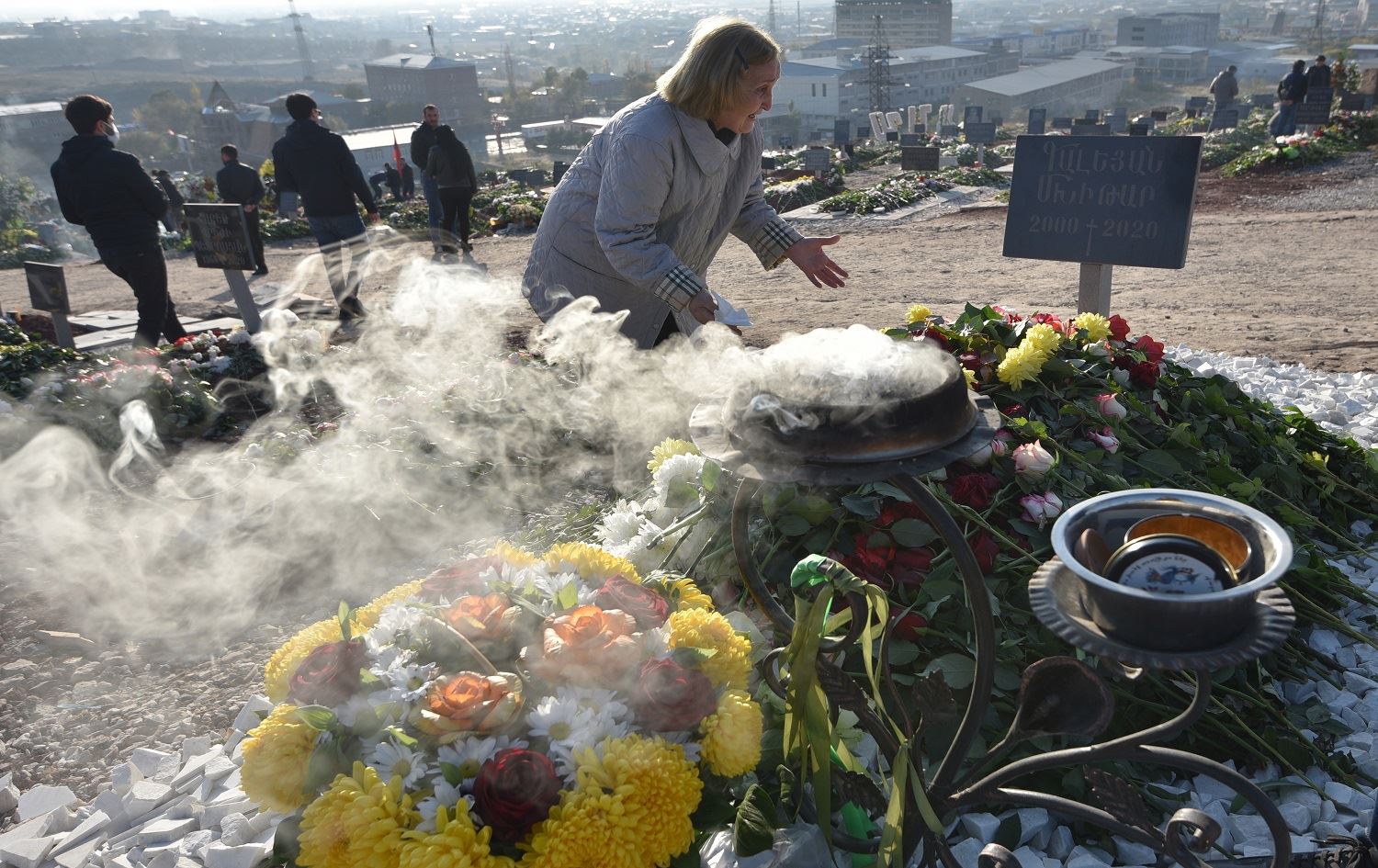 A relative mourns at the grave of an Armenian soldier killed during the military conflict between Armenia and Azerbaijan over the disputed Nagorno-Karabakh region, at Yerablur Military Memorial Cemetery in Yerevan, on November 14, 2020. Photo: Karen Minasyan / AFP