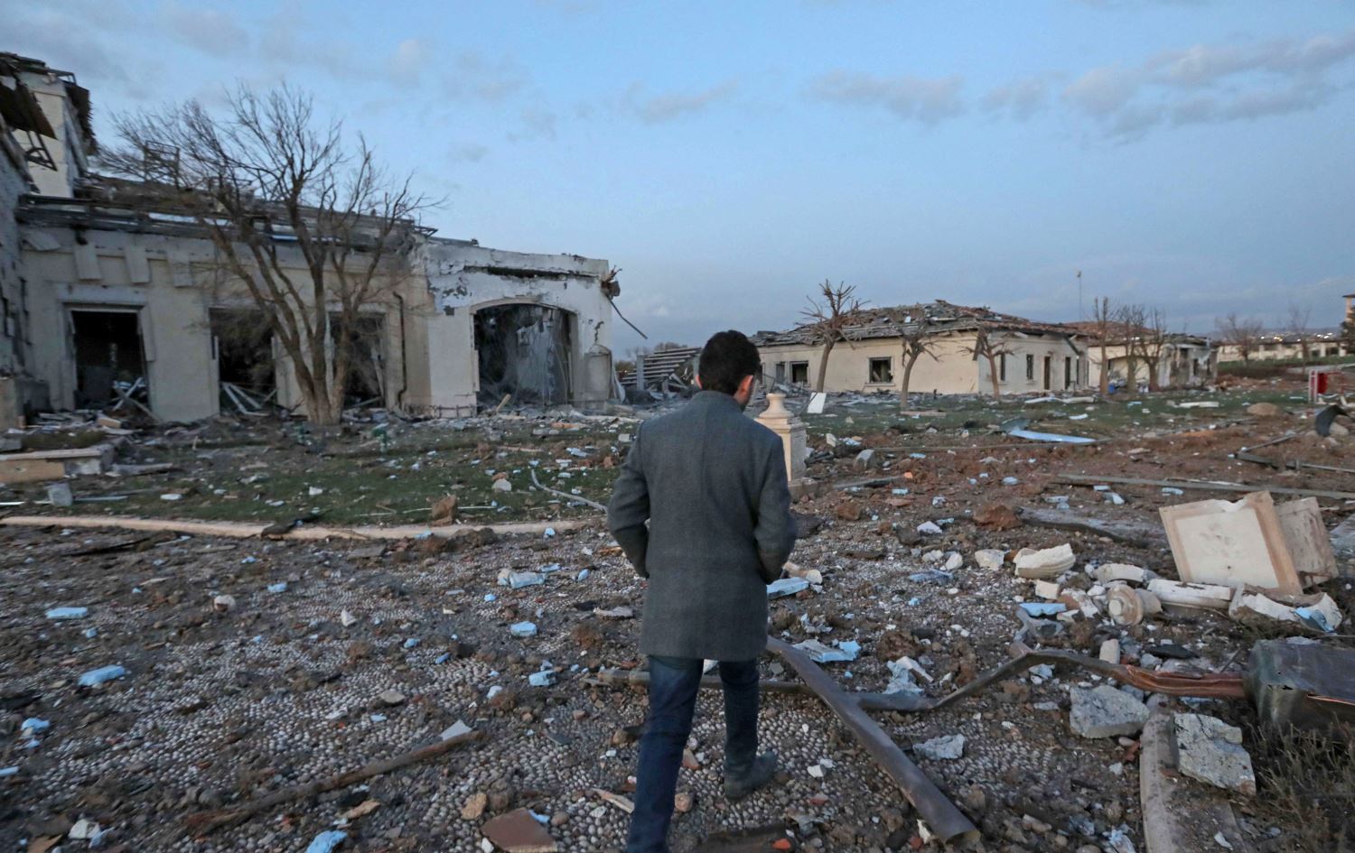 A man walks past damaged civilian properties following the missile strike on Erbil on March 13, 2022. Photo: Safin Hamed/AFP