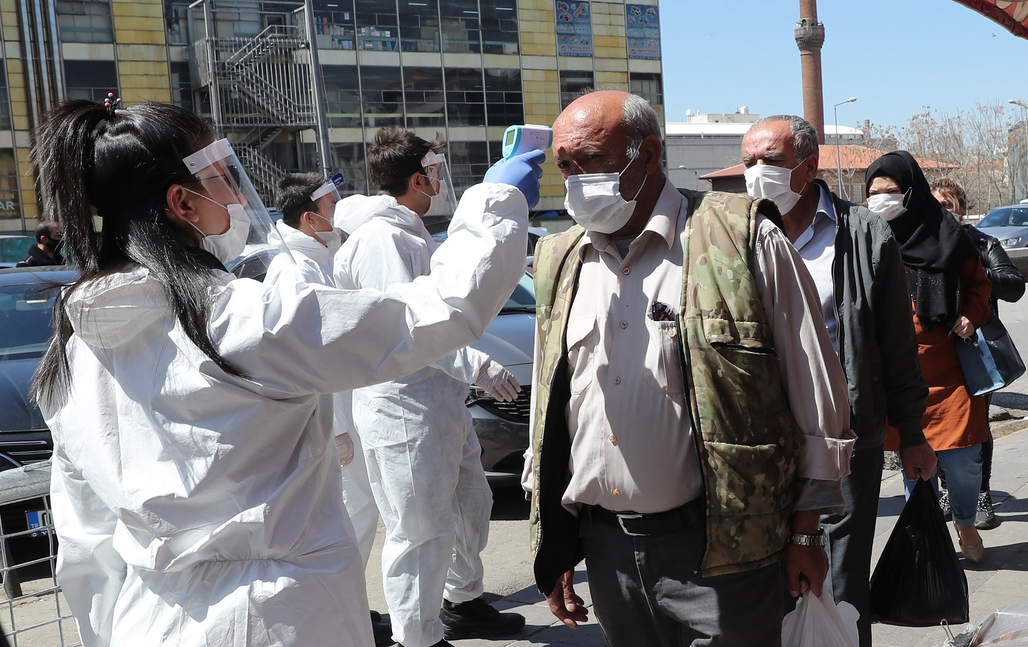 A health official checks a man's body temperature at the covered bazaar in the historic Ulus district, Ankara on April 17, 2020. Photo: Adem Altan / AFP