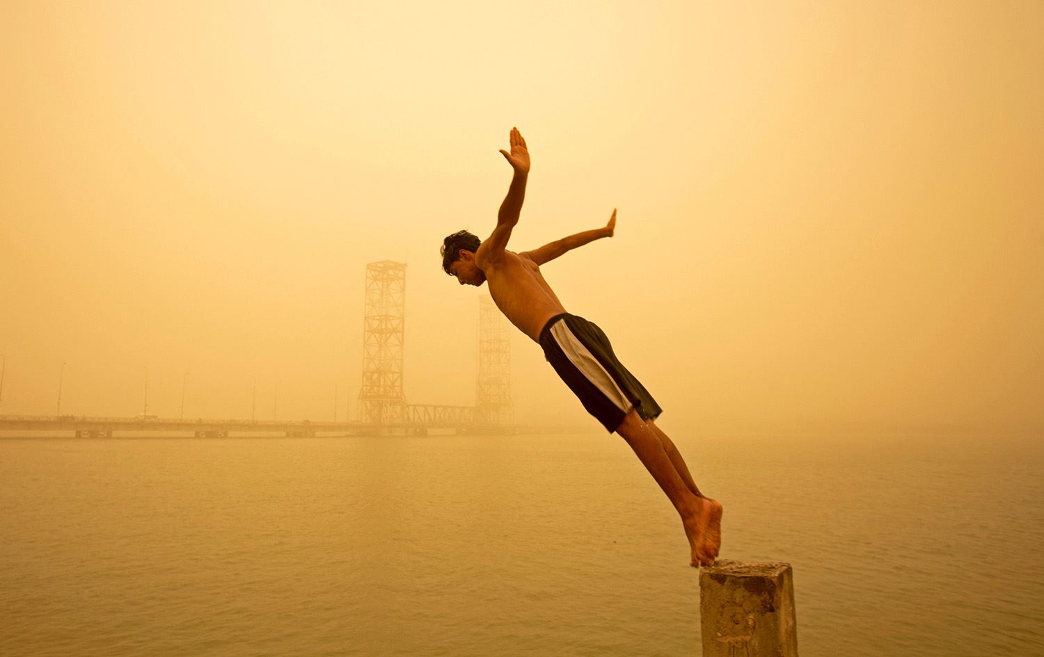A youth dives in the Shatt al-Arab river during a sandstorm in Iraq's southern city of Basra on May 16, 2022. Photo: Hussein Faleh/AFP