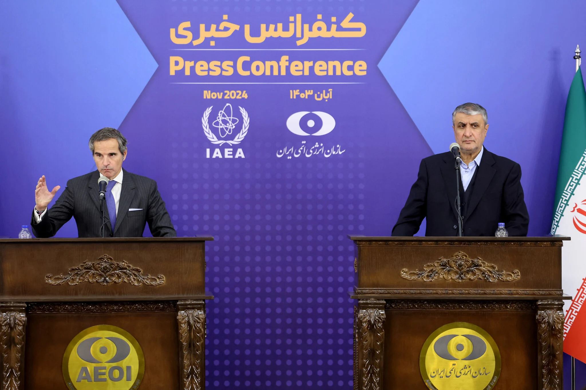 Iran's nuclear chief Mohammad Eslami (R) and the United Nations nuclear chief Rafael Grossi give a joint press conference in Tehran on November 14, 2024. Photo: AFP