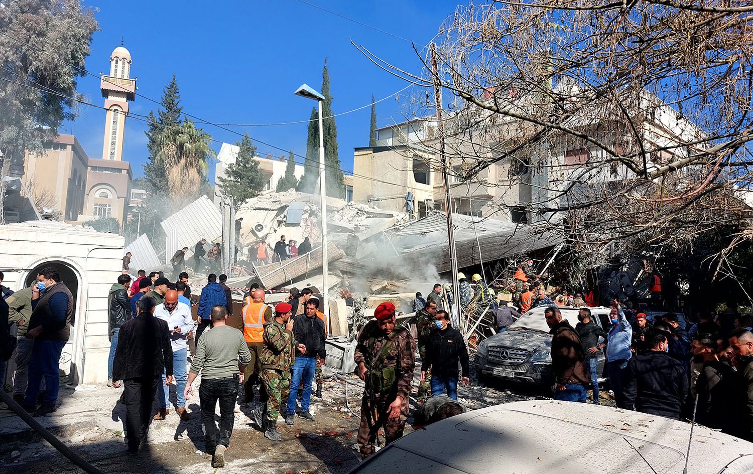 People and security forces gather in front of a building destroyed in a reported Israeli strike in Damascus on January 20, 2024. Photo: Louai Beshara/AFP