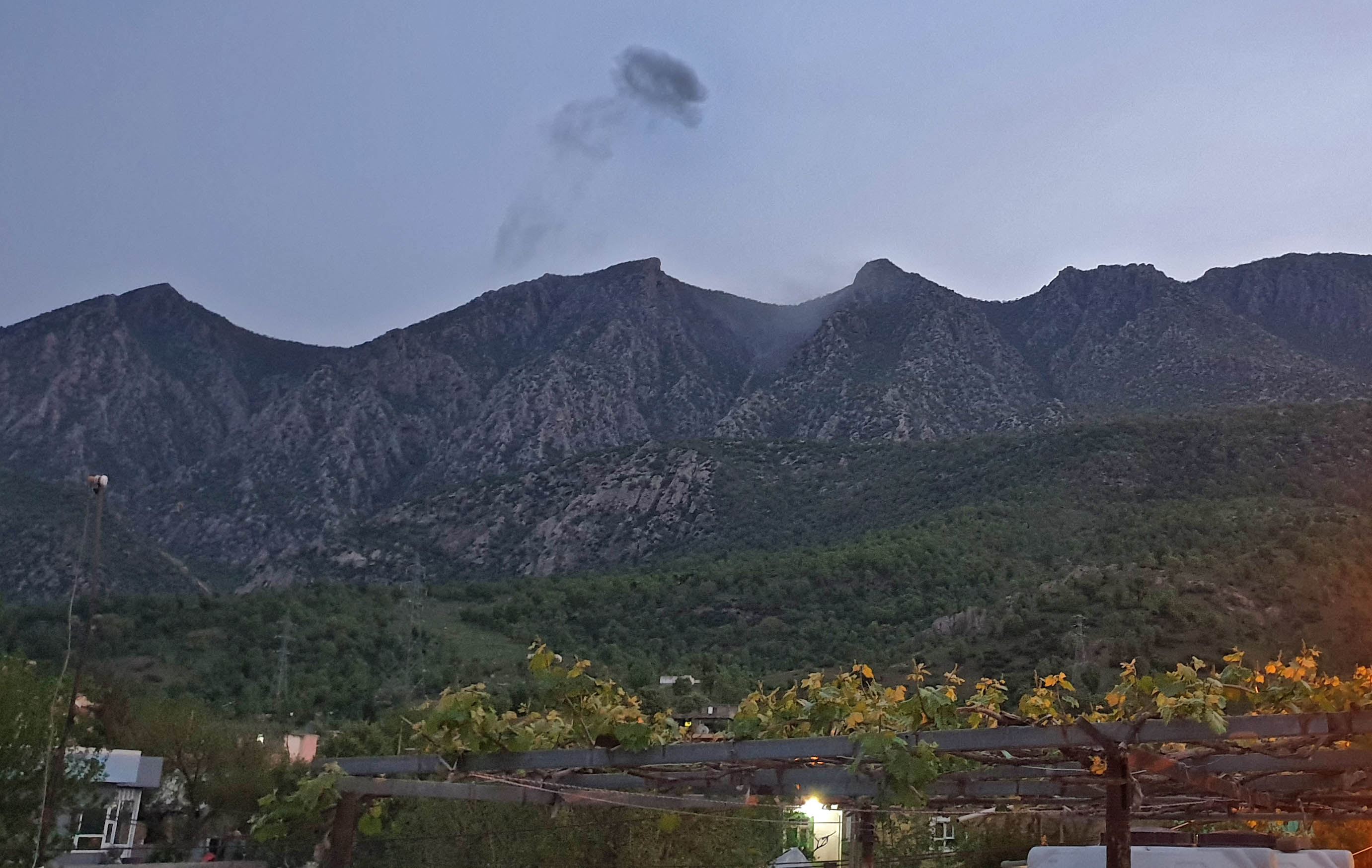 Smoke billowing from behind the mountains of Matin in the town of Shiladze following a Turkish offensive targeting rebels in the Kurdistan Region, on April 19, 2022. Photo: AFP