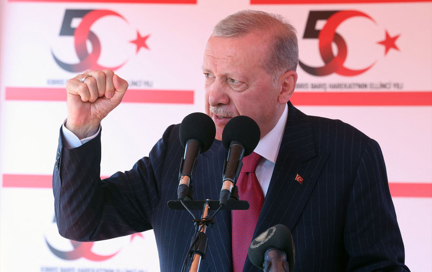 Turkish President Recep Tayyip Erdogan speaking during a campaign in Cyprus on July 20, 2024. Photo: AFP/ TURKISH PRESIDENTIAL PRESS SERVICE