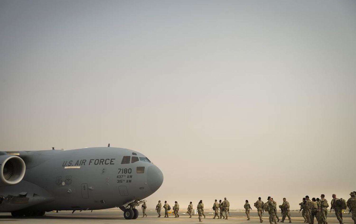 This image taken by the US Air Force shows US Army troops from the 1st Combined Arms Battalion, board a C-17 Globemaster III during an exercise during an exercise at Ali Al Salem Air Base, Kuwait, August 10, 2022. Photo: Dalton Willians/US Air Force/AP